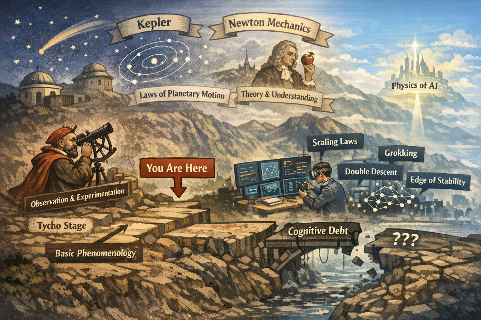 If we use the Tycho–Kepler–Newton analogy, today’s AI development largely remains at the Tycho stage—experimentation and observation. Yet even at the level of observation, what we currently have is extremely primitive: most people focus on tuning for a handful of performance-based metrics. This stems from a fundamental difference in goals between physics and AI. Physics aims to transform the world by understanding it, where understanding itself occupies a central position. As a result, the field is very tolerant of work that provides insight even if it is (temporarily) useless. In contrast, AI aims directly to transform the world. The scaling laws of recent years have allowed the field to skip the “understanding” step and jump straight into transforming AI itself. In my view, this constitutes a form of cognitive debt—one that will inevitably have to be repaid, sooner or later, if not already.