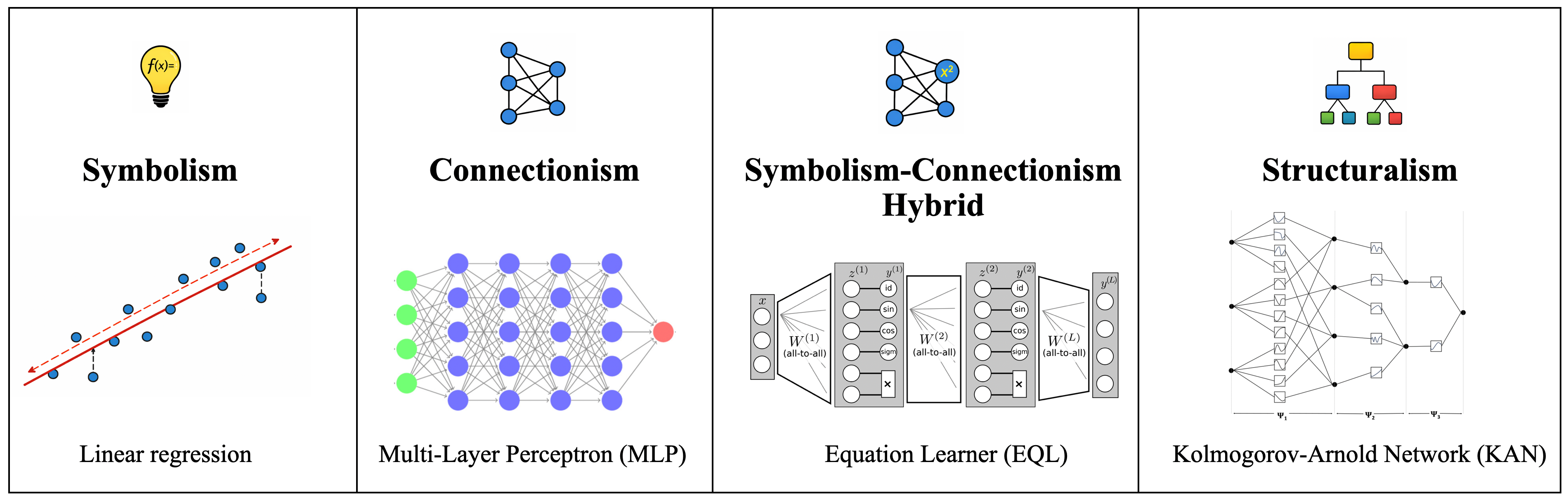 In supervised learning, this distinction is already quite concrete. Linear regression is symbolic. Multi-layer perceptrons are connectionist. EQL represents a neural–symbolic hybrid. Kolmogorov–Arnold Networks (KANs), by contrast, are structuralist. The representation theory underlying KANs compactly captures the compositional structure of multivariate functions. As a result, KANs are neither structureless like MLPs, nor overconstrained like linear models, nor plagued by instability from neural–symbolic mismatch.