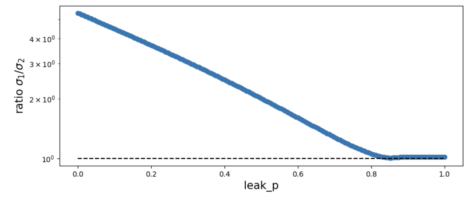 Although I expect that \(\sigma_1/\sigma_2\) would smoothly interpolate between two extremes, there is a first order phase transition around \(p_c\approx 0.8\). For \(p>p_c\), the ratio remains close to 1. For \(p<p_c\), the ratio grows exponentially (the y axis is log-scale) as \(p\) decreases. I don’t understand why.