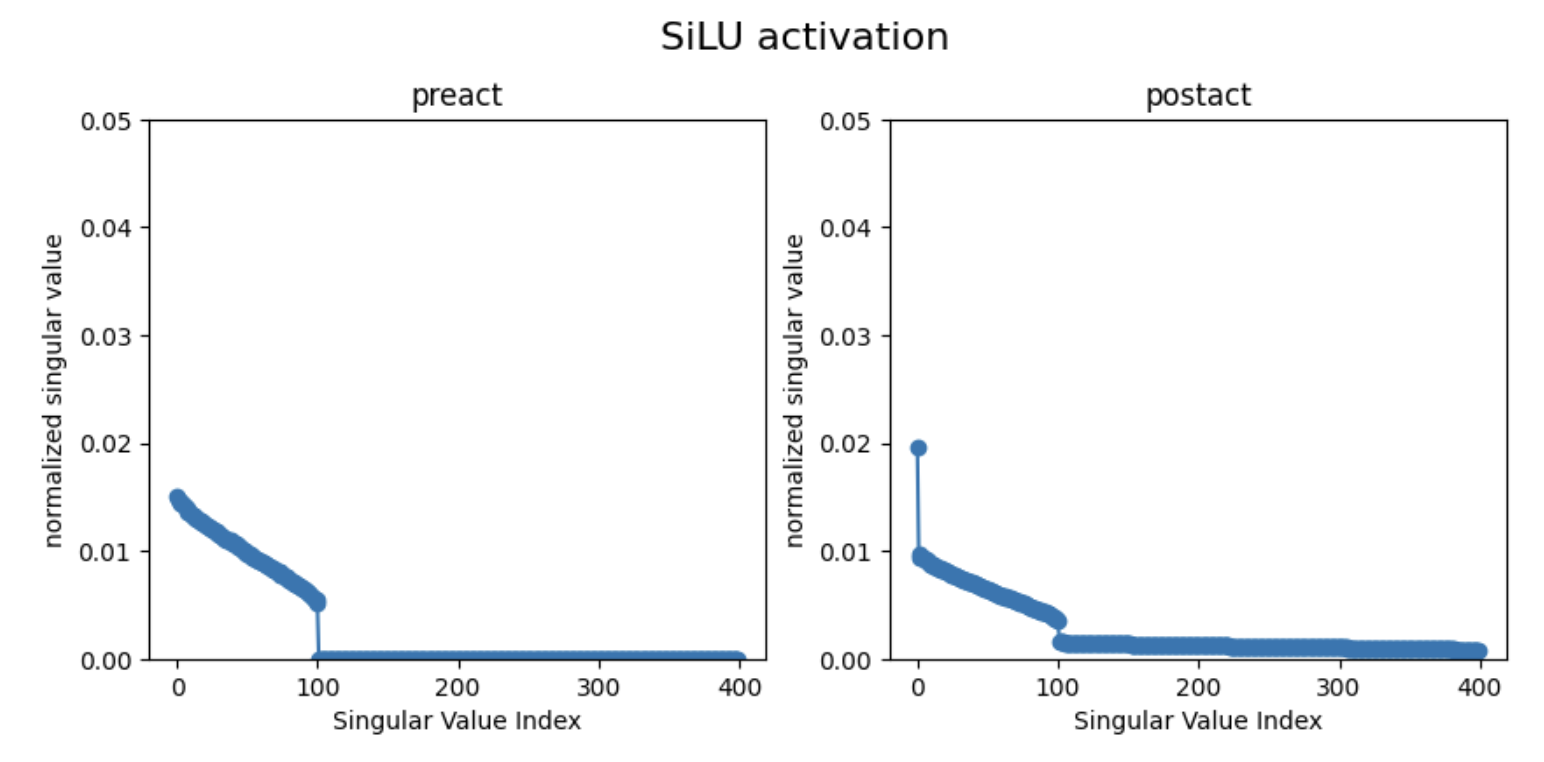 We consider an LNL (linear-nonlinear) model, which is basically a two-layer MLP excluding the down projection layer: \(h_{\rm pre} = Wx, h_{\rm post} = \sigma(h_{\rm pre})\) where \(\sigma(\cdot)\) is the activation function. We set \(x\in\mathbb{R}^d\) to be isotropic – \(N\) samples are drawn from standard Gaussian distribution. \(W\in\mathbb{R}^{d\times D}\) is randomly initialized. We set \(d=100, D=400, N=10000\). We won’t train the model, and will only be interested in characterizing the anisotropy of \(h_{\rm post}\). We can stack \(h_{\rm post}\) of all \(N\) samples into a matrix \(H\in\mathbb{R}^{N\times D}\).