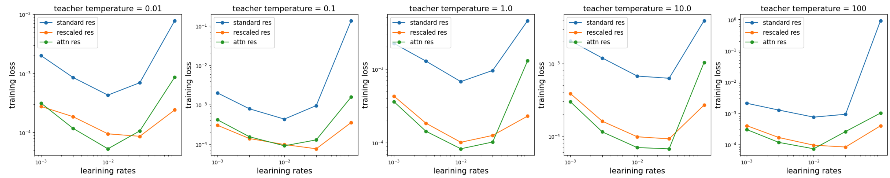 To test whether attention residual indeed benefits from breaking this uniform bias, I construct a teacher–student setup. The teacher network is a randomly initialized Attention Residual network, but the attention matrices are treated as fixed (randomly generated). A temperature parameter controls how uniform the “true” attention is: when the temperature is high, the attention is uniform; when the temperature is low, the attention is peaked (close to one-hot). A student network is then trained to fit the dataset generated by the teacher.