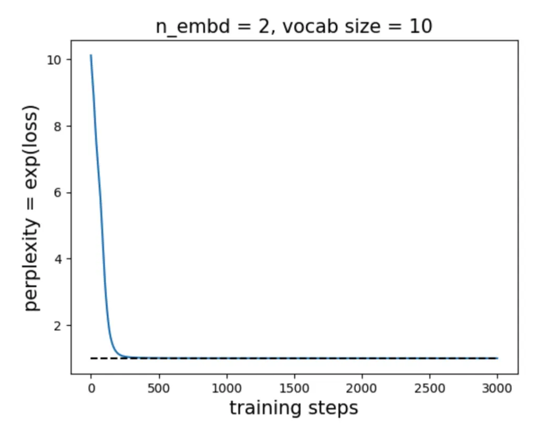 In contrast, \(n_{\rm embd} = 4\) is sufficient to reach the optimal perplexity of 2.