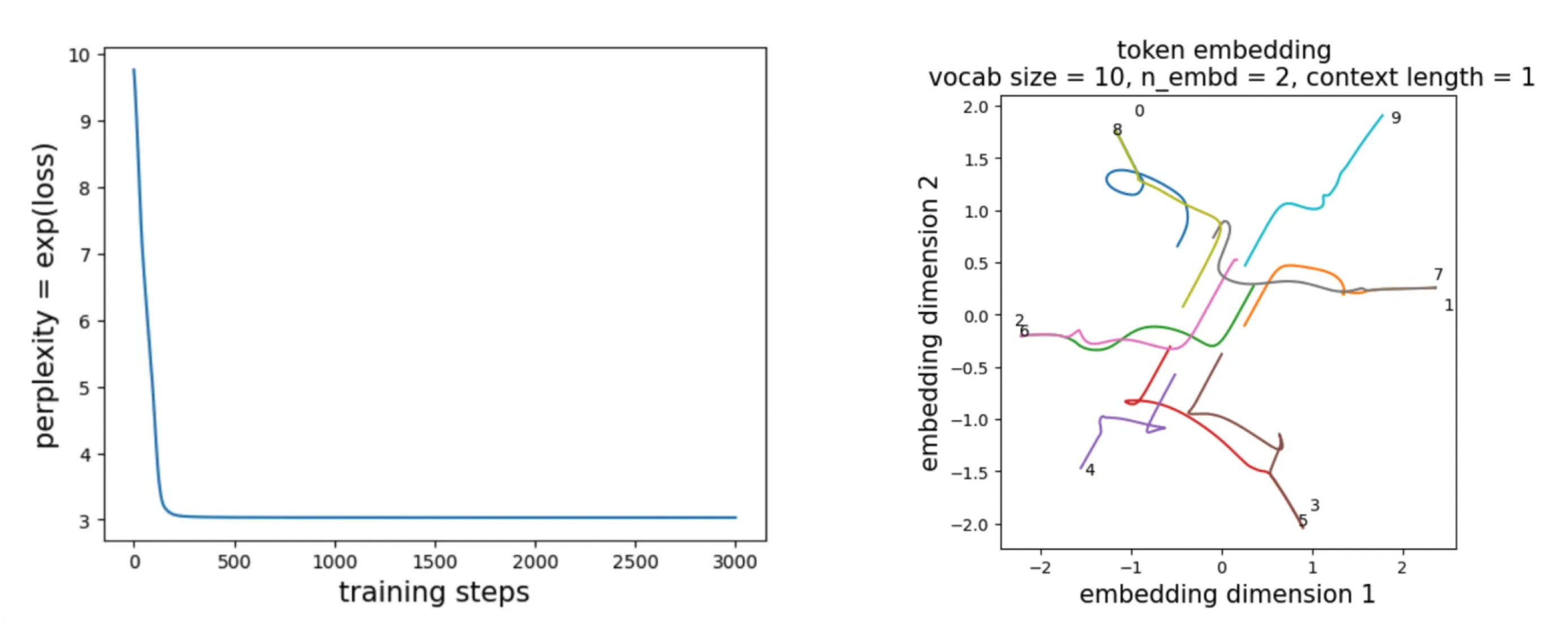 For \(n_{\rm embd} = 2\), the left plot below shows that the perplexity only decreases to about 3—corresponding to confusion among roughly three choices—whereas the optimal perplexity is 2. This indicates that \(n_{\rm embd} = 2\) is insufficient. The right plot shows that the embedding vectors do learn some notion of continuity (for example, 4 is close to 3 and 5, and 9 is close to 0 and 8), but the overall geometry is inconsistent (for instance, 1/7 lies diagonally relative to 2/6).