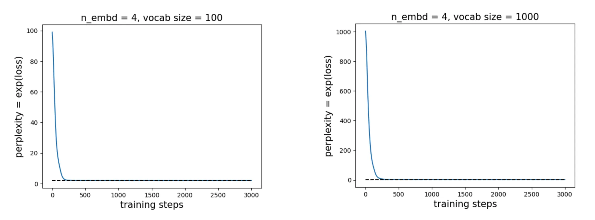Moreover, the required embedding dimension appears to be independent of vocabulary size. For example, with vocab sizes of 100 or even 1000, the model still achieves the optimal perplexity of 2 with \(n_{\rm embd} = 4\).
