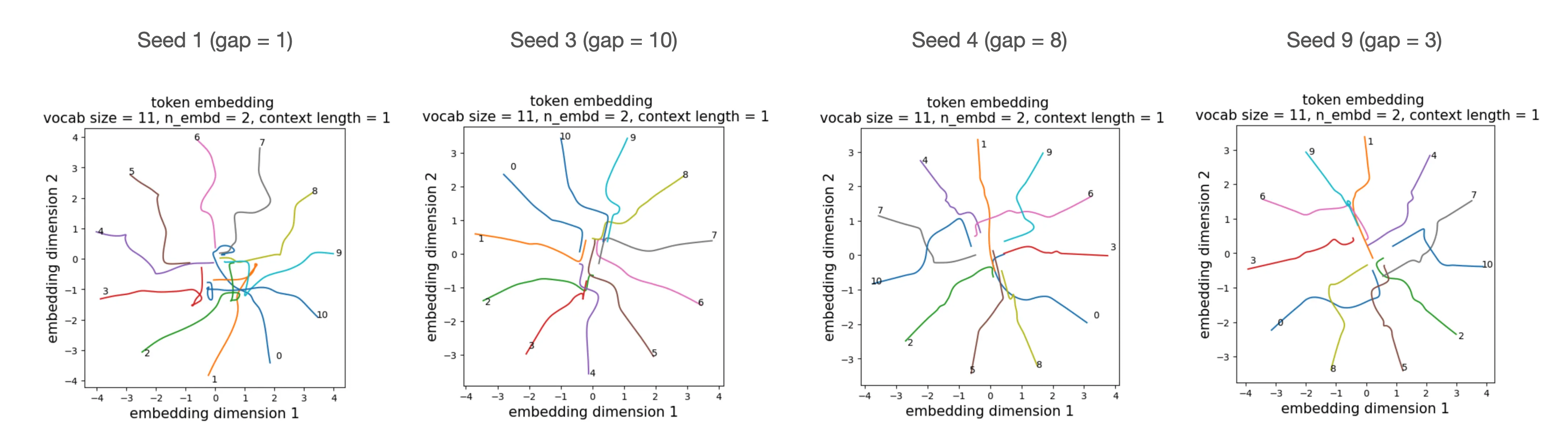 Interestingly, there are many equivalent embedding configurations that solve this task, and the model converges to one of them depending on initialization.