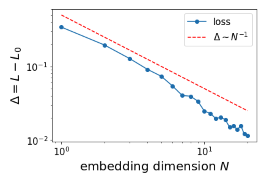 We now set \(V=100\) and \(R=20\), and sweep \(N\) from 1 to 20. Defining the loss gap \(\Delta \equiv L - L_0,\) we find that it closely follows a scaling law \(\Delta \sim N^{-1}.\) This can be viewed as a generalization of the result reported in this paper.
