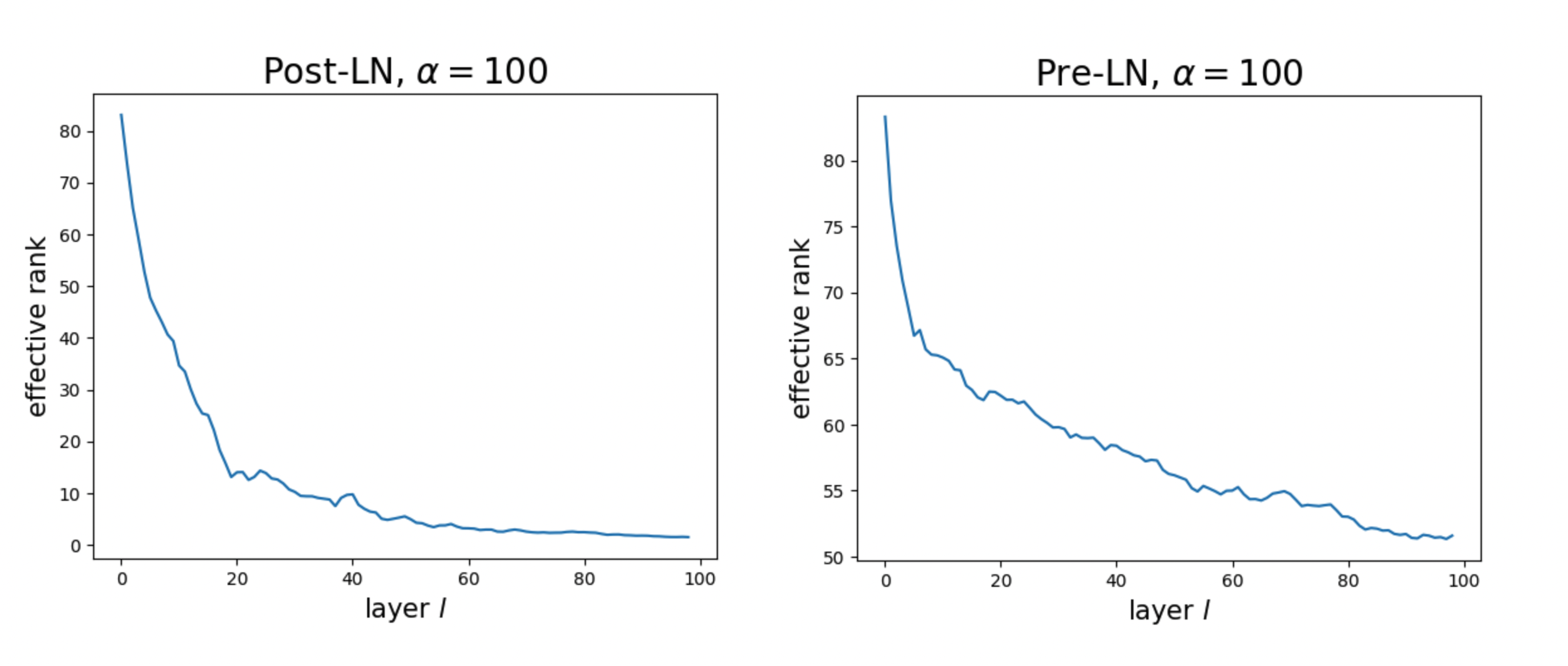 We also compute the effective rank of \(h^l\): we apply PCA to a point cloud of \(h^l\), normalize the singular values into a probability distribution, compute its entropy, and then exponentiate it. The results suggest that Pre-LN maintains representation rank better than Post-LN.