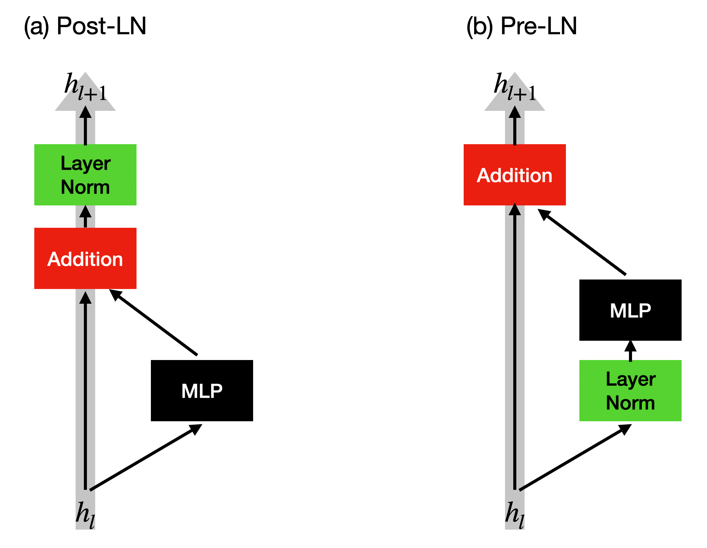 If we say that Pre-LN suffers from the problem that later layers become “useless”, then Post-LN suffers from the opposite problem: early layers become “useless”. Due to Post-LN, \(\lVert h^l \rVert\) remains approximately constant across layers. As a result, signals originating from early layers keep shrinking as they propagate forward, leading to vanishing influence on the output (and correspondingly, vanishing gradients).