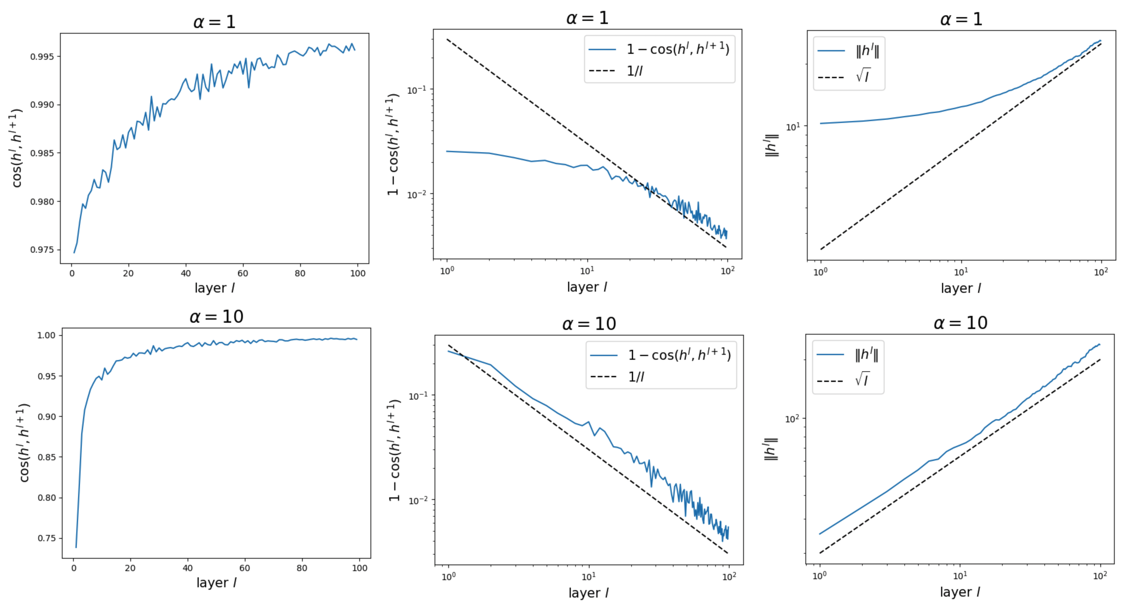 The norm of the update is roughly constant, while the norm of \(h^l\) keeps growing. Therefore, the relative angular update satisfies \(\theta \sim 1/\lVert h^l \rVert \sim 1/\sqrt{l}\), which implies \(1 - {\rm cos}(h^l, h^{l+1}) \sim \theta^2 \sim 1/l\).