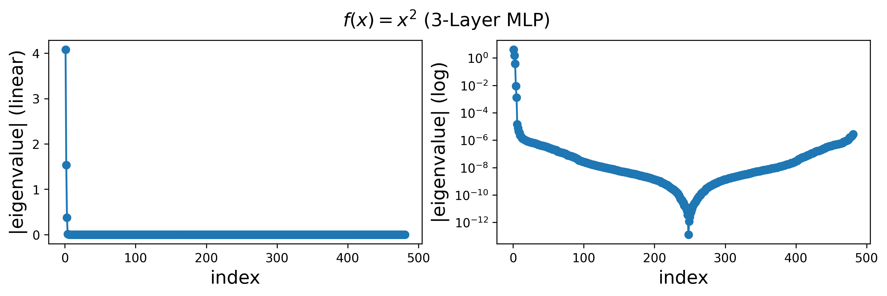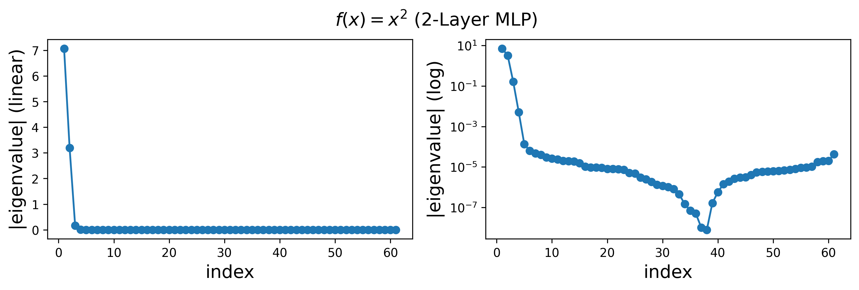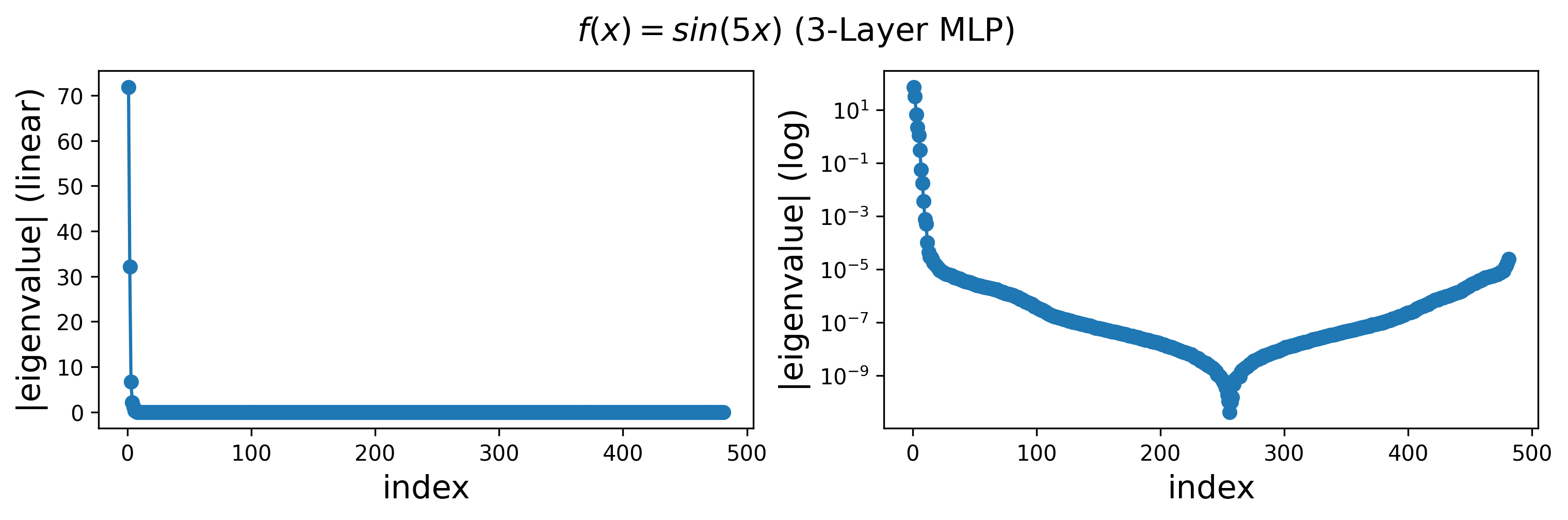 After training, we obtain the model parameters \(\theta\). We then compute the Hessian \(H \equiv \frac{\partial^2 \ell}{\partial \theta^2},\) and its eigenvalues \(\lambda_i\) and eigenvectors \(v_i\) satisfying \(H v_i = \lambda_i v_i.\)