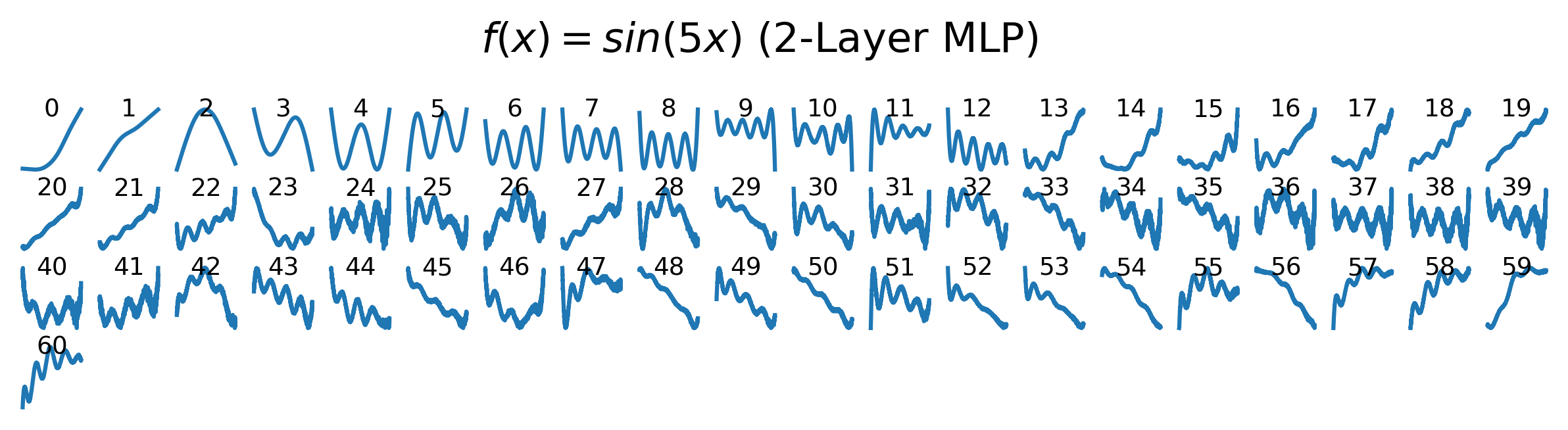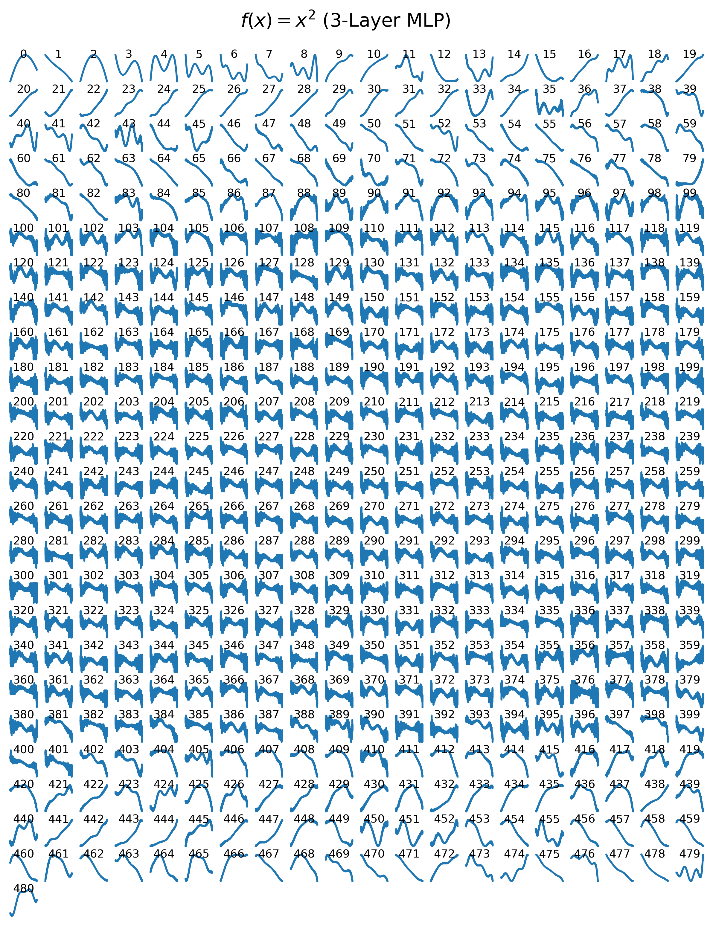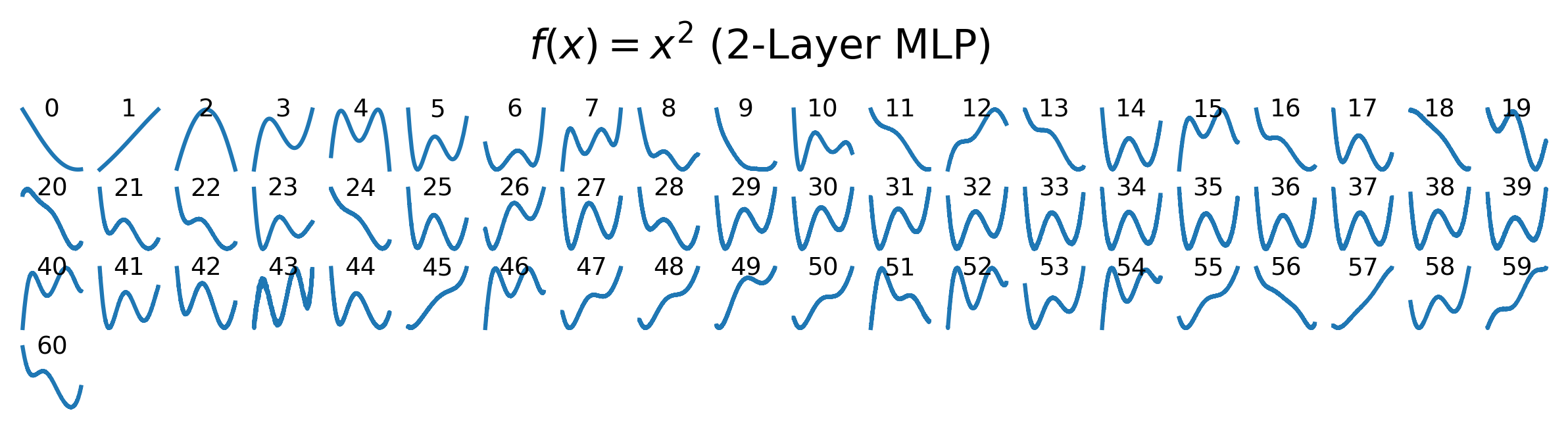 We consider MLPs with hidden width 20, and compare 2-layer and 3-layer architectures. The task is 1D regression, either \(f(x) = x^2 \quad \text{(smooth)}\) or \(f(x) = \sin(5x) \quad \text{(oscillatory)}.\) We sample \(x \sim U[-1, 1]\). The networks are trained using the MSE loss with the Adam optimizer.