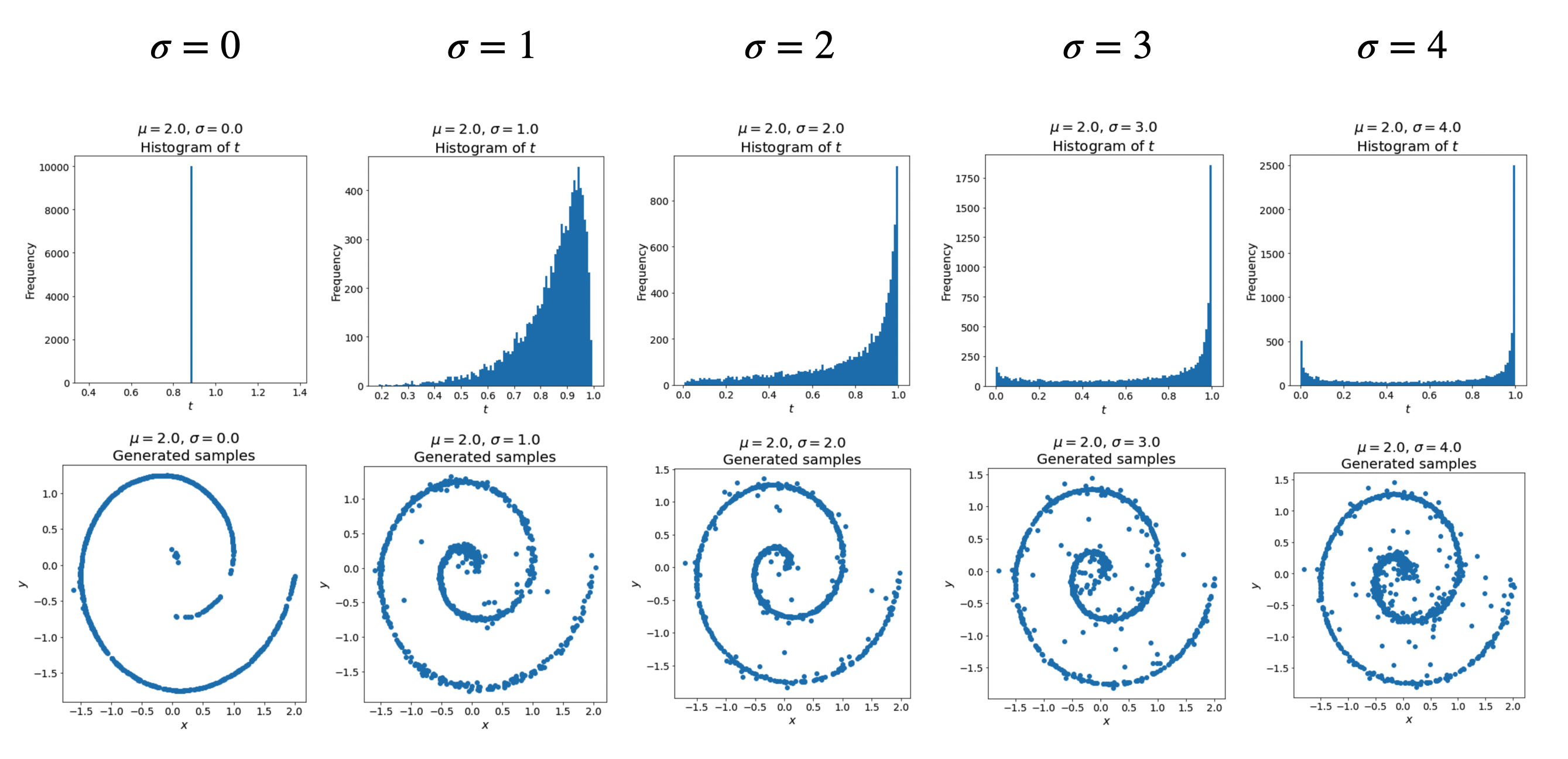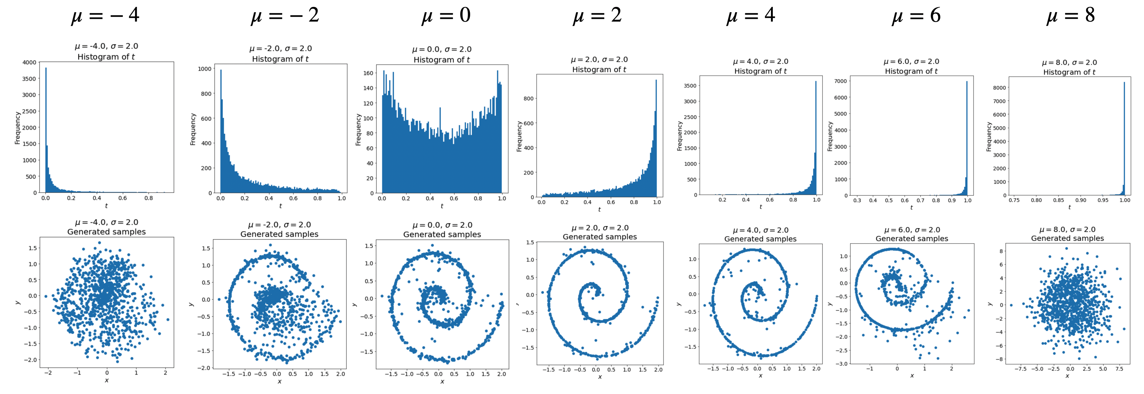 Specifically, \(t\) is sampled from a logit-normal distribution: \(t = \frac{1}{1 + e^{-X}}, \quad X \sim \mathcal{N}(\mu, \sigma^2).\) However, the main paper does not clearly specify how \((\mu, \sigma)\) are chosen. I therefore experimented with different values to understand their effects. Note that \(t = 0\) corresponds to pure noise, while \(t = 1\) corresponds to clean data.