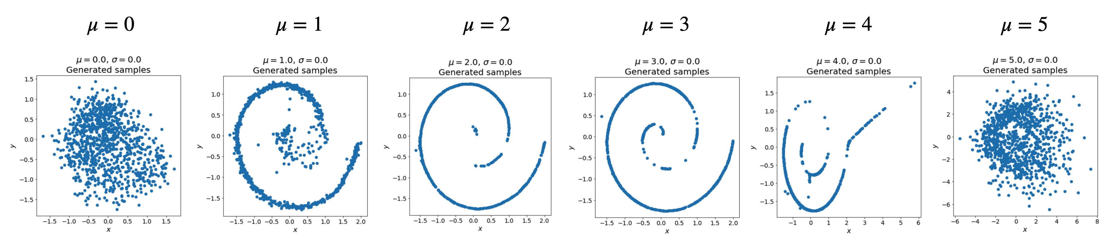 Somewhat surprisingly, \(\sigma = 0\) can still lead to decent generation quality. We therefore fix \(\sigma = 0\) and vary \(\mu\):