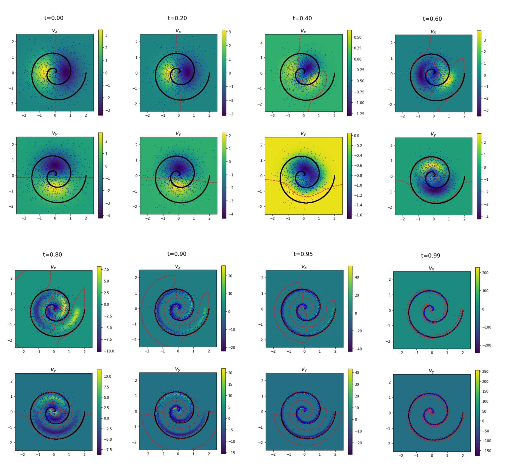 This makes it clear why training at a single \(t \sim 0.9\) can already yield high-quality samples: the zero-velocity contours align well with the spiral manifold. Under this velocity field, samples naturally converge toward the zero-velocity region.