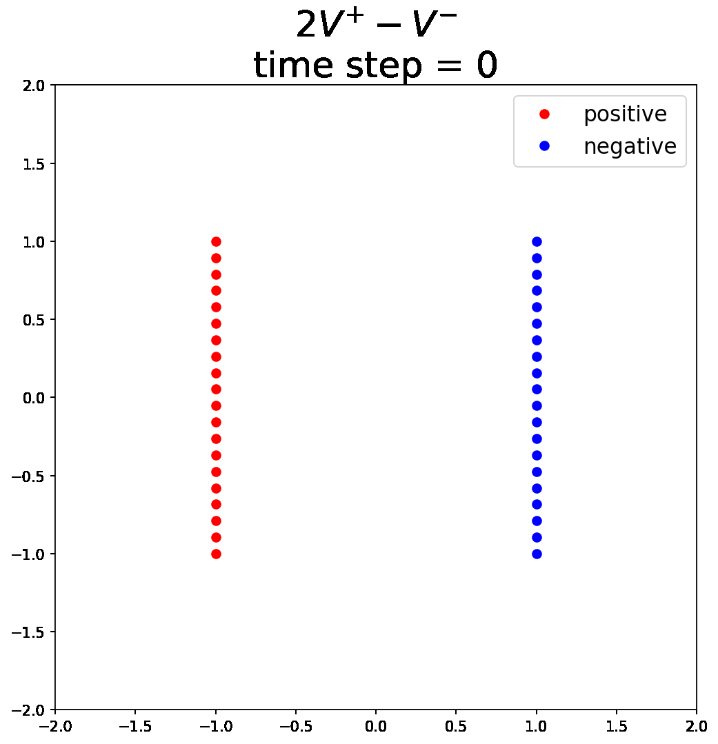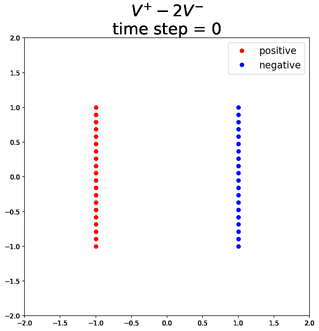 The paper reports that the combination \(V^+ - V^-\) performs best, which is exactly what the physical picture suggests. For alternatives such as \(2V^+ - V^-\) or \(V^+ - 2V^-\), the system is no longer neutral. As a result, the negative particles either collapse toward the center of the positive particles or are driven too far away.