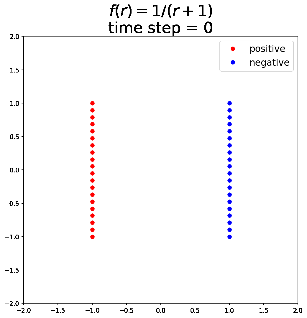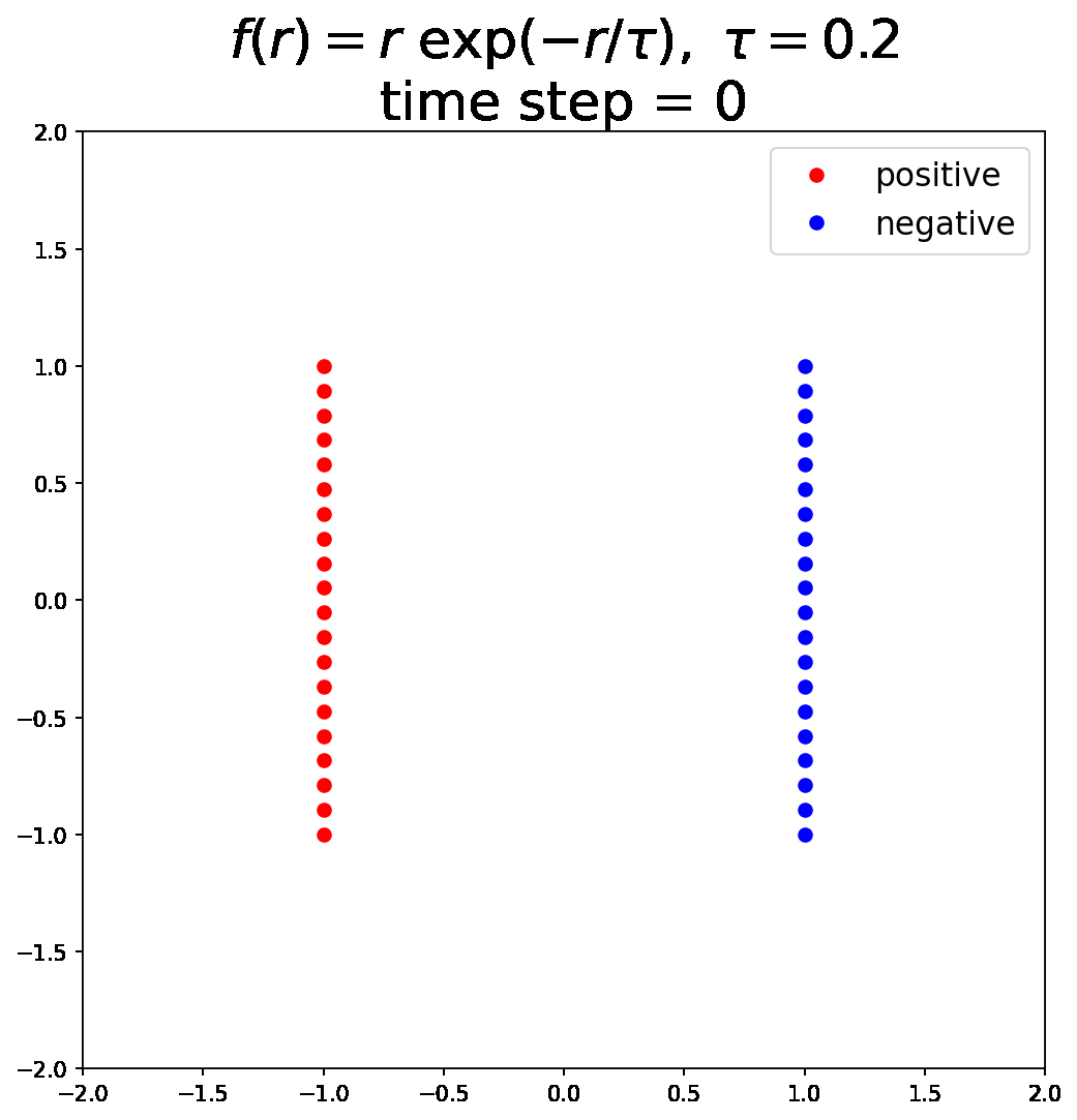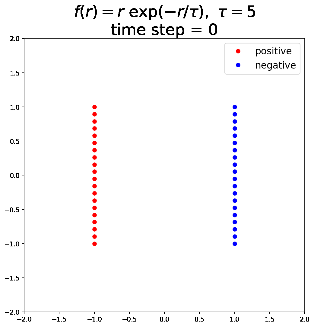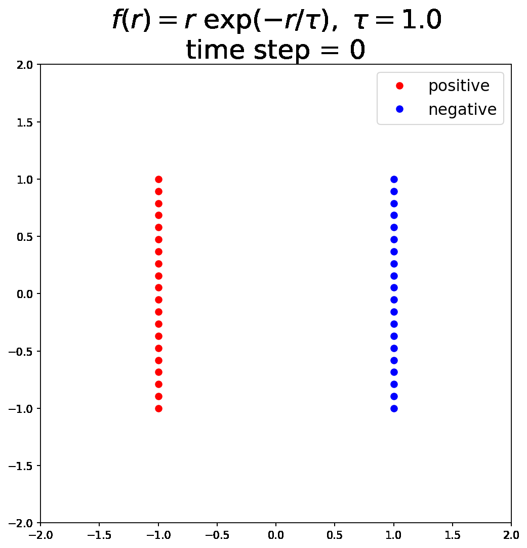 - The negative particles are released and move according to a force field determined by interactions with positive particles (\(V^+\)) and with other negative particles (\(V^-\)). For any pair of particles, the force magnitude is \(f(r)\) (corresponding to their kernel \(K\)). The paper uses \(K(r) = \exp\!\left(-\frac{r}{\tau}\right),\) which corresponds to a Yukawa-type potential. Negative charges are attracted to positive charges and repelled by other negative charges.