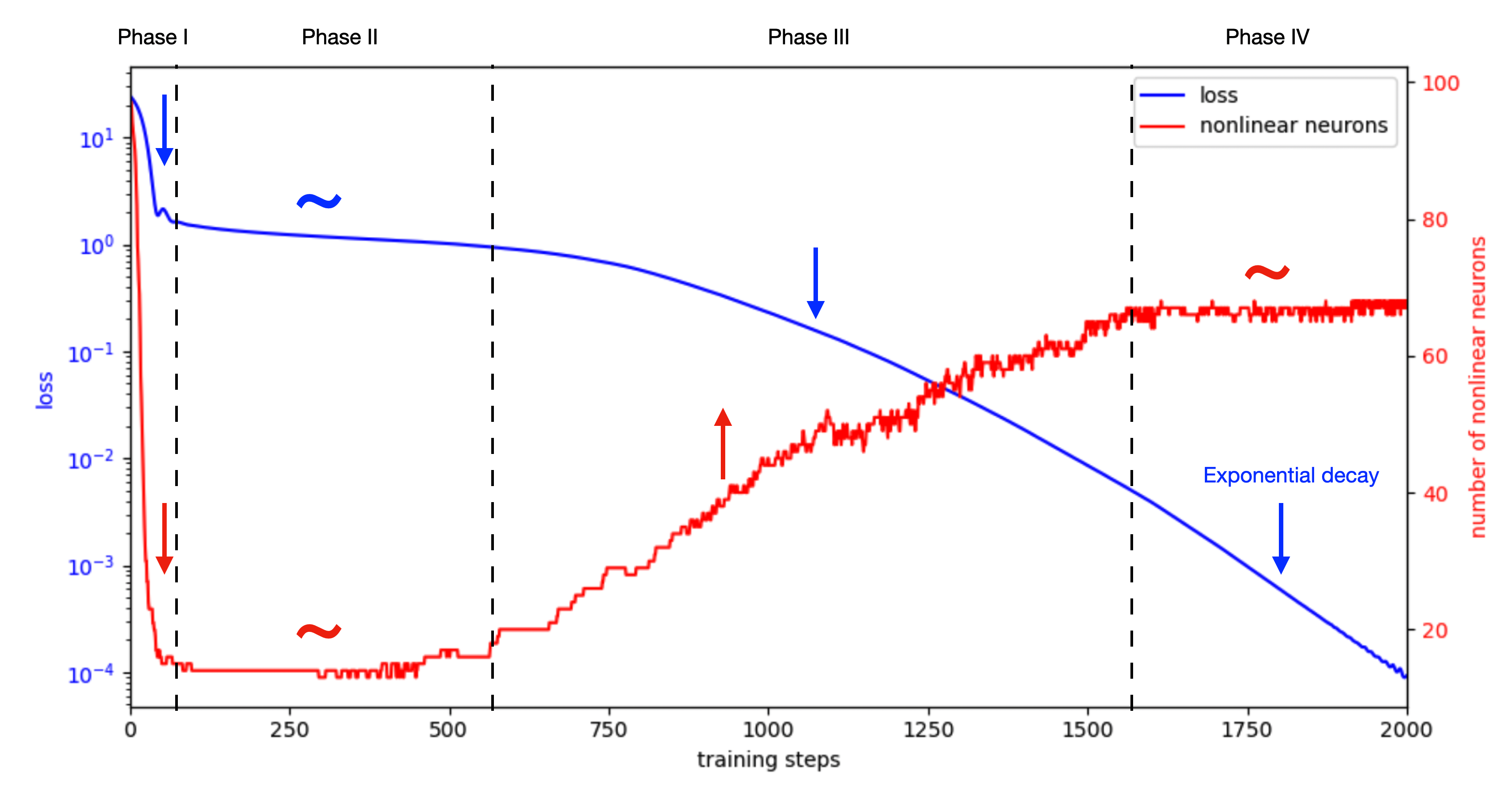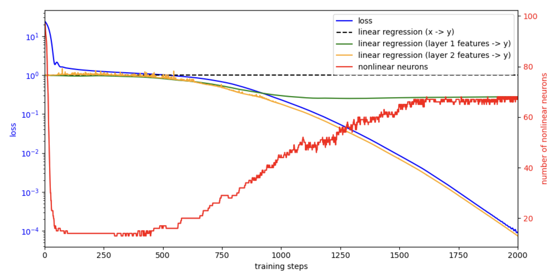 Rather than starting from mathematical derivations, I decided to go straight to experiments. Beyond plotting the loss, we also wanted to define observables that characterize features. One of the most basic observables is the number of nonlinear neurons. This measure does not care about the specific form of the features, only whether they are nonlinear.