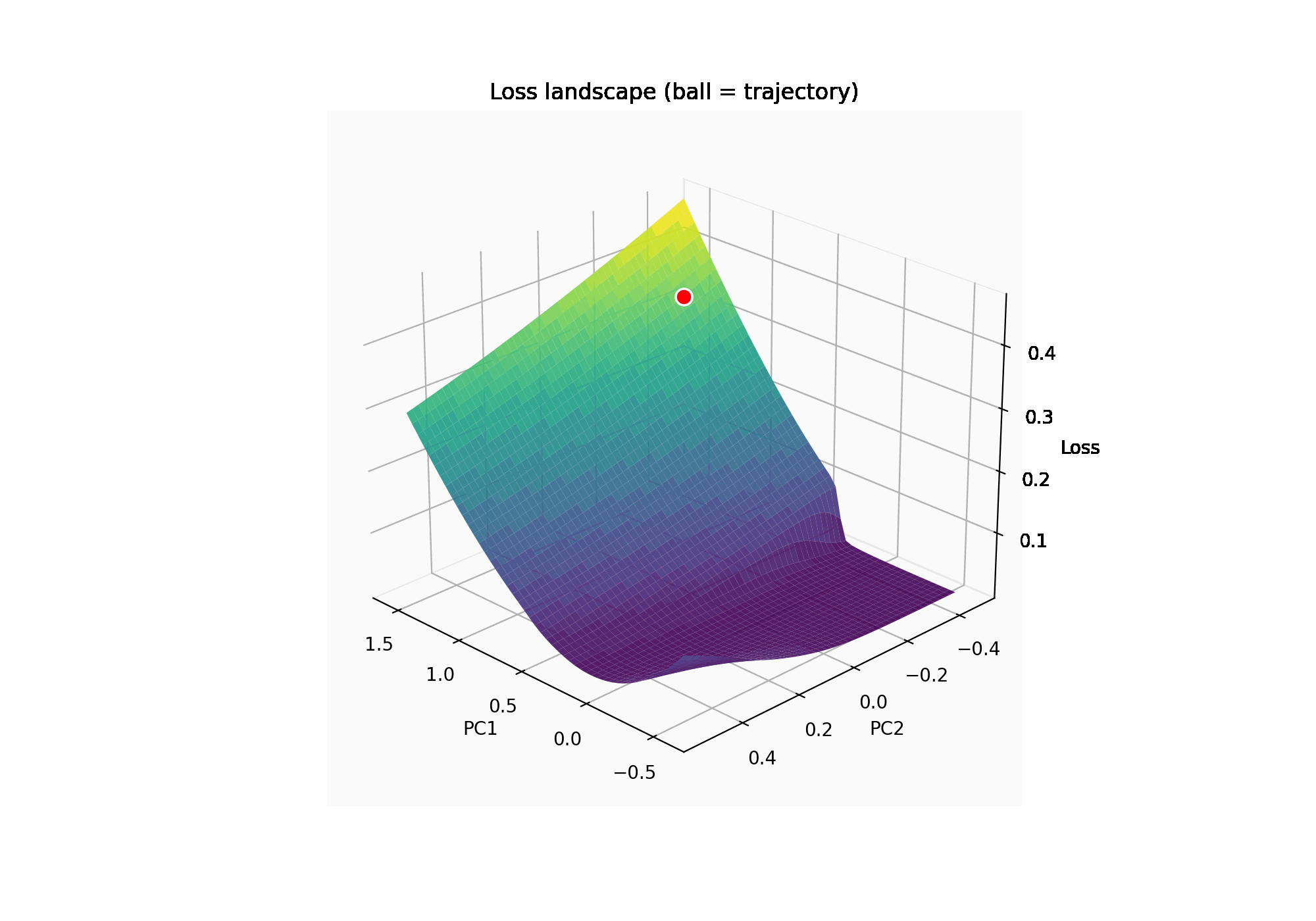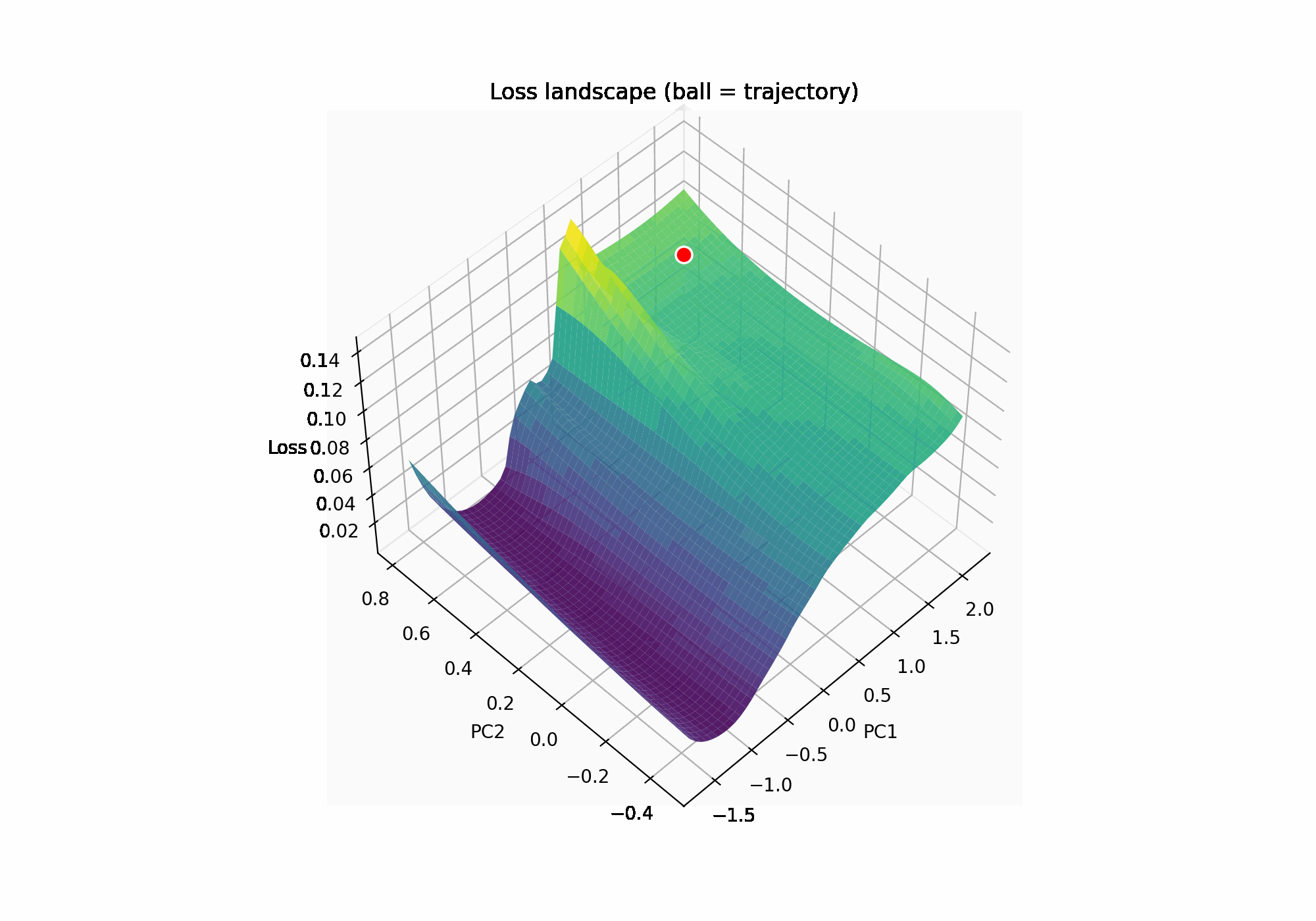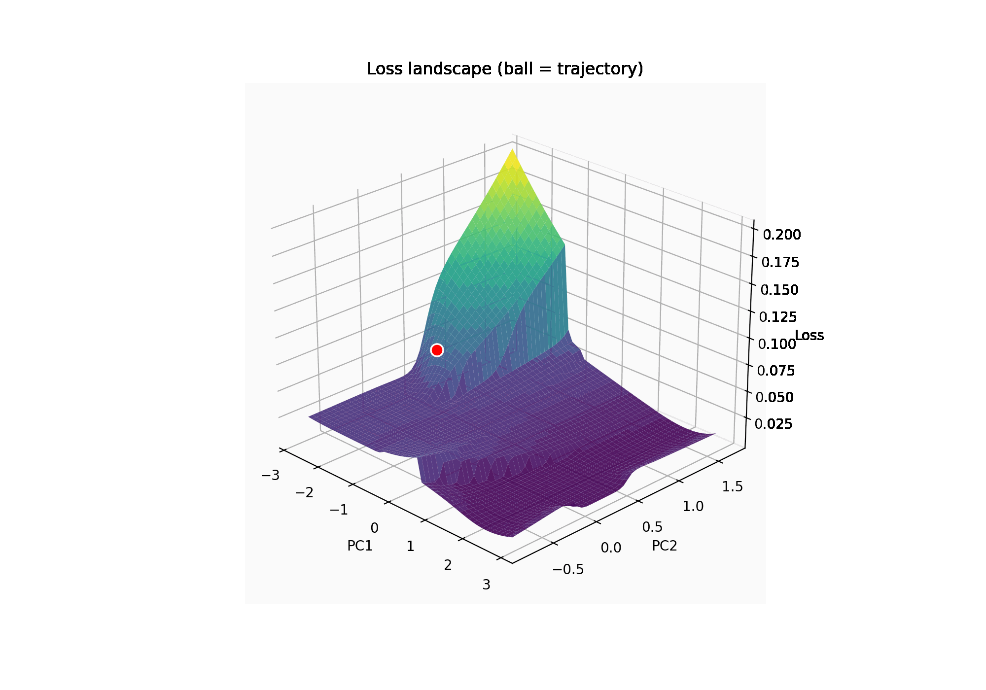 I love picturing optimization as “a ball rolling down a hill”. However, real loss landscape of neural networks are very high-dimensional. A convenient way is to apply PCA to weight trajectory, but unfortunately this does not capture local information well (see my prompt below). A obvious problem is that the trajectory points do not lie exactly on the 2D PC plane.