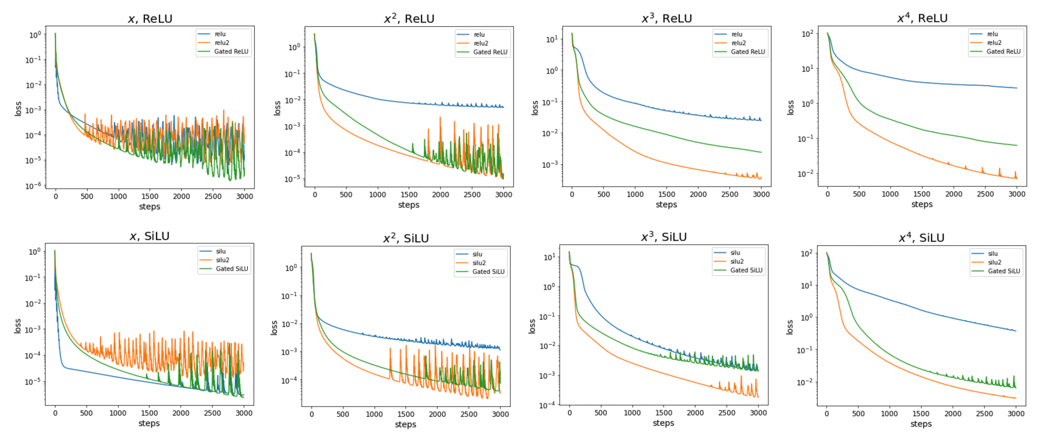 For both ReLU and SiLU activations, gated MLPs (green) consistently outperform non-gated MLPs (blue) when fitting \(x^n\) for all \(n \ge 2\). We also compare against non-gated MLP but with the activation function squared (orange), and find that squared activation functions can achieve strong performance—sometimes even better than gated networks.