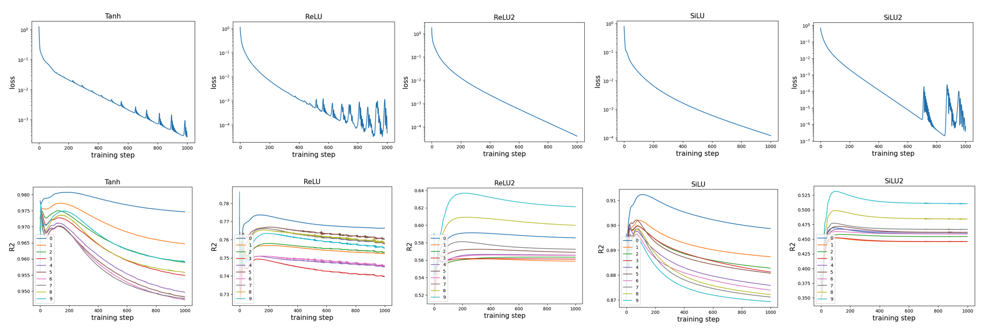 We observe that lower \(R^2\) values tend to correspond to lower losses, which aligns with the intuition that a lower \(R^2\) indicates stronger nonlinearity. One could attempt to minimize \(R^2\) further—for example, by using high-frequency sine functions—but this would likely harm trainability. There appears to be a trade-off between stability and nonlinearity.