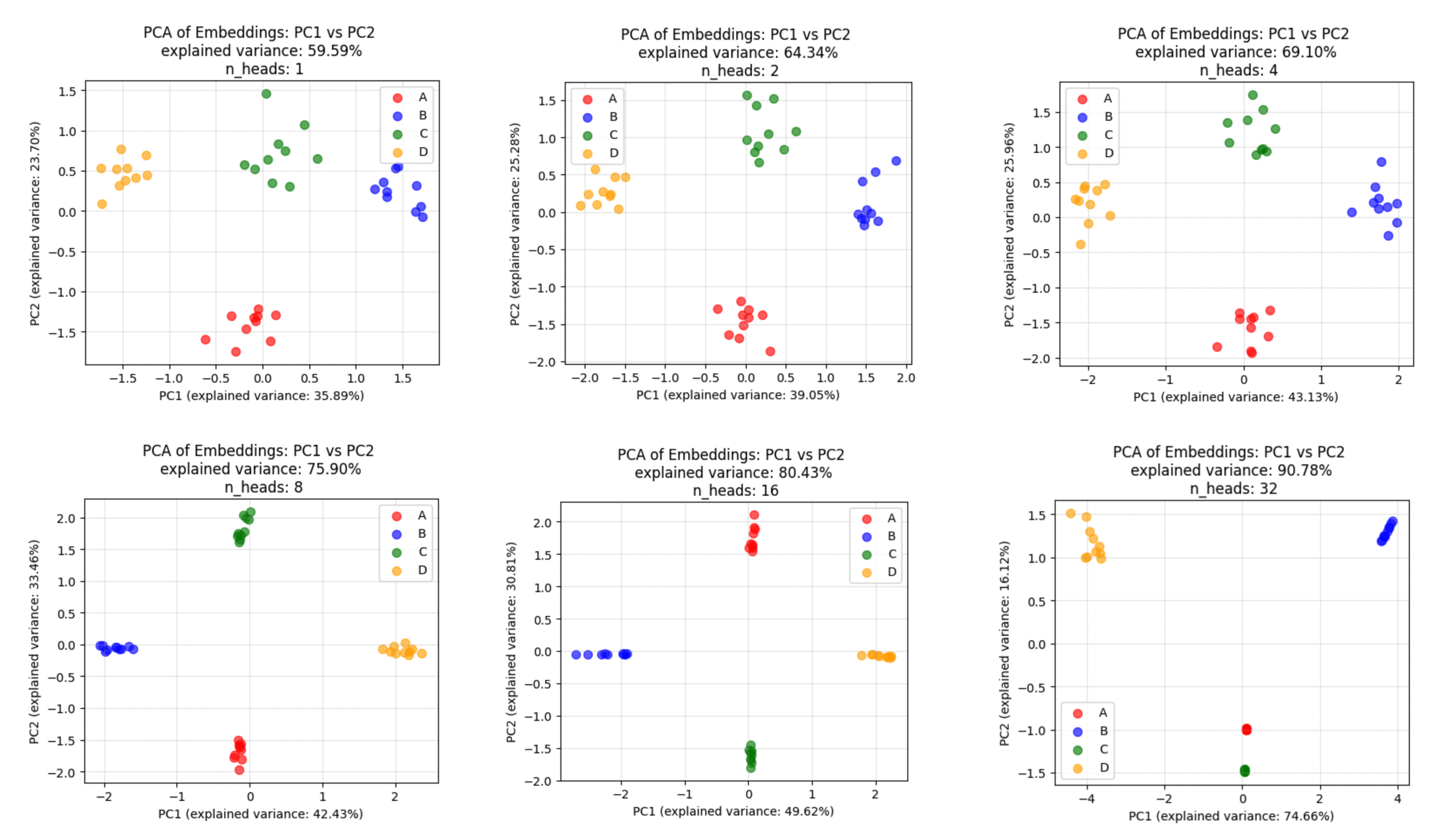 We perform PCA on the embedding space and project each token embedding onto PC1/PC2. We find that as the number of heads increases: