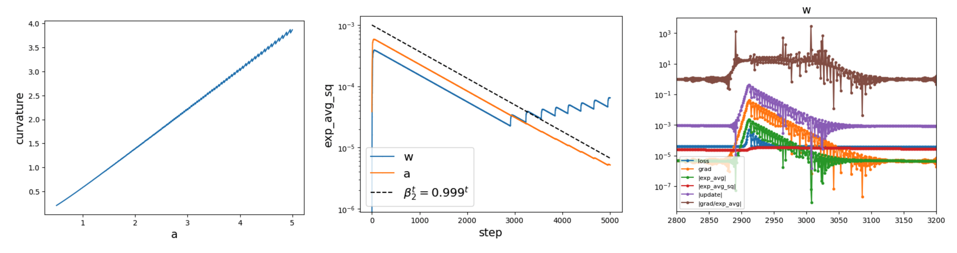 A plausible explanation for the spike periodicity is therefore the following: each spike amplifies exp_avg_sq by some constant factor, and the interval between spikes corresponds to the time it takes for this factor to decay back to 1 (or slightly above 1, since the curvature increases slowly over time). The curvature is roughly a linear function of \(a\) (left plot), and Adam statistics are also shown in the right plot.