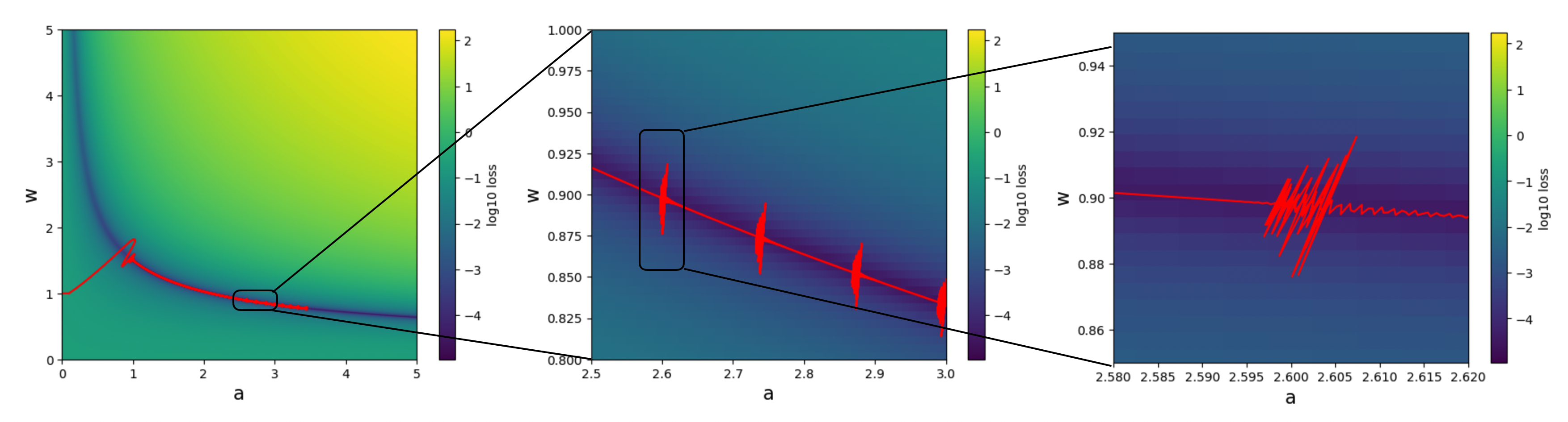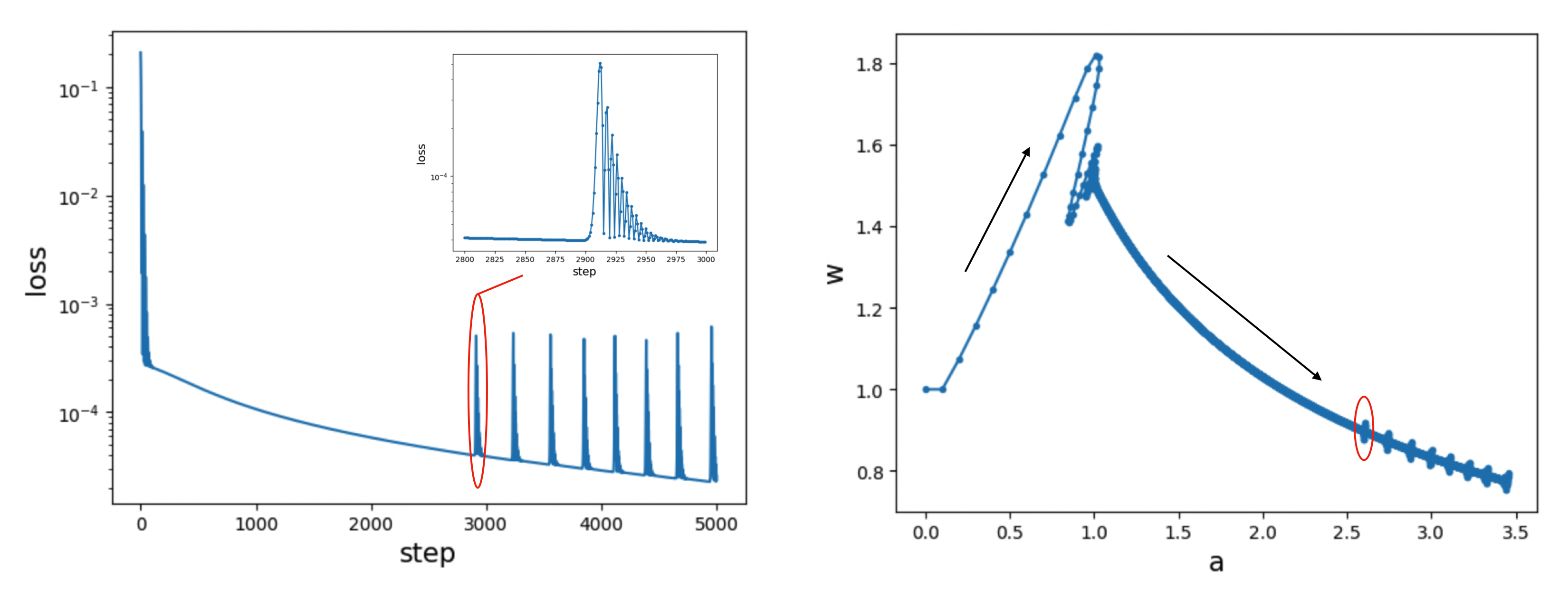 We initialize \(w = 1\) and \(a = 0\), and train using the Adam optimizer (learning rate 0.1) for 5000 steps. The left plot shows that the training loss exhibits spikes. When zoomed in, each spike is asymmetric: a rapid instability followed by a gradual recovery. The right plot shows the training trajectory, which appears to consist of two phases whose dominant movement directions are nearly orthogonal. Loss spikes occur in the second phase, where the parameters seem to navigate a long, narrow valley—known as a river-valley landscape.