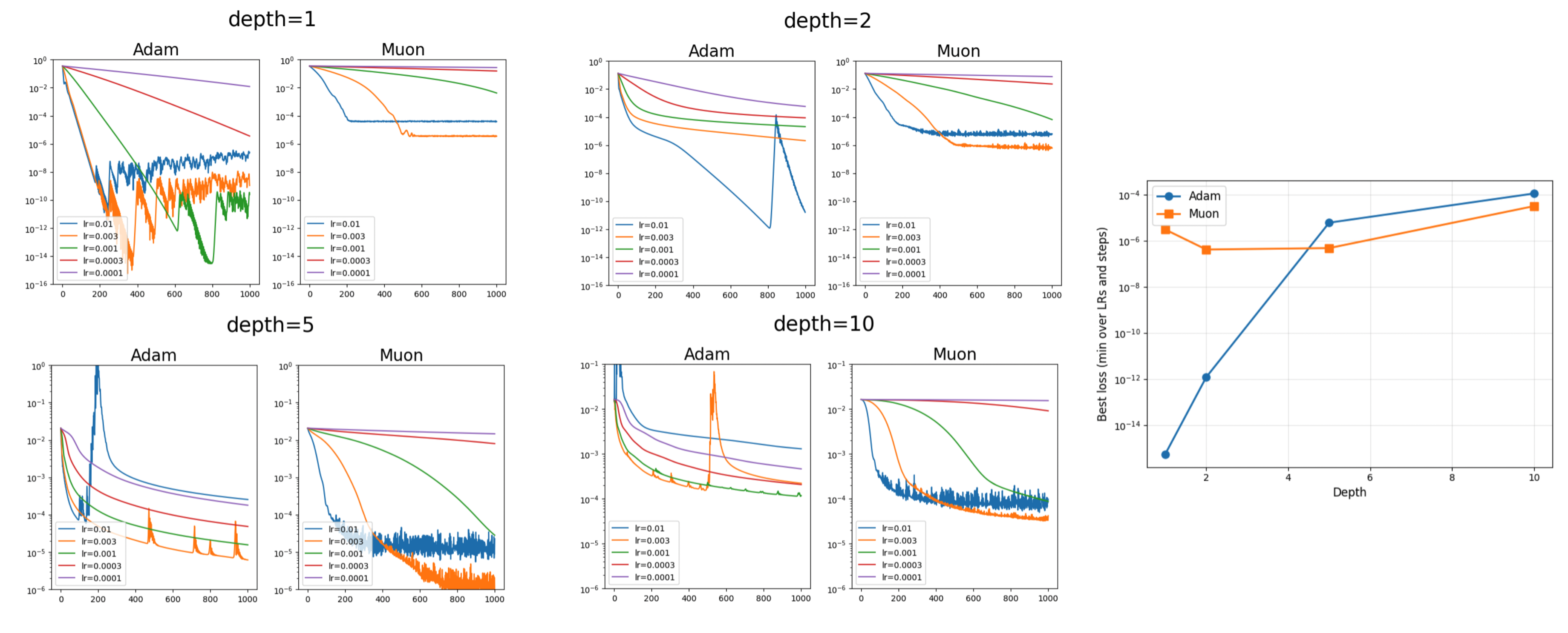 I started with depth = 1. Despite extensive attempts (including tuning \(W_{\rm gt}\)), I could not find a setting where Muon outperforms Adam. This led me to hypothesize that Muon may work better in harder optimization settings, for example when the network is deeper. Interestingly, the experiments indeed support this hypothesis.