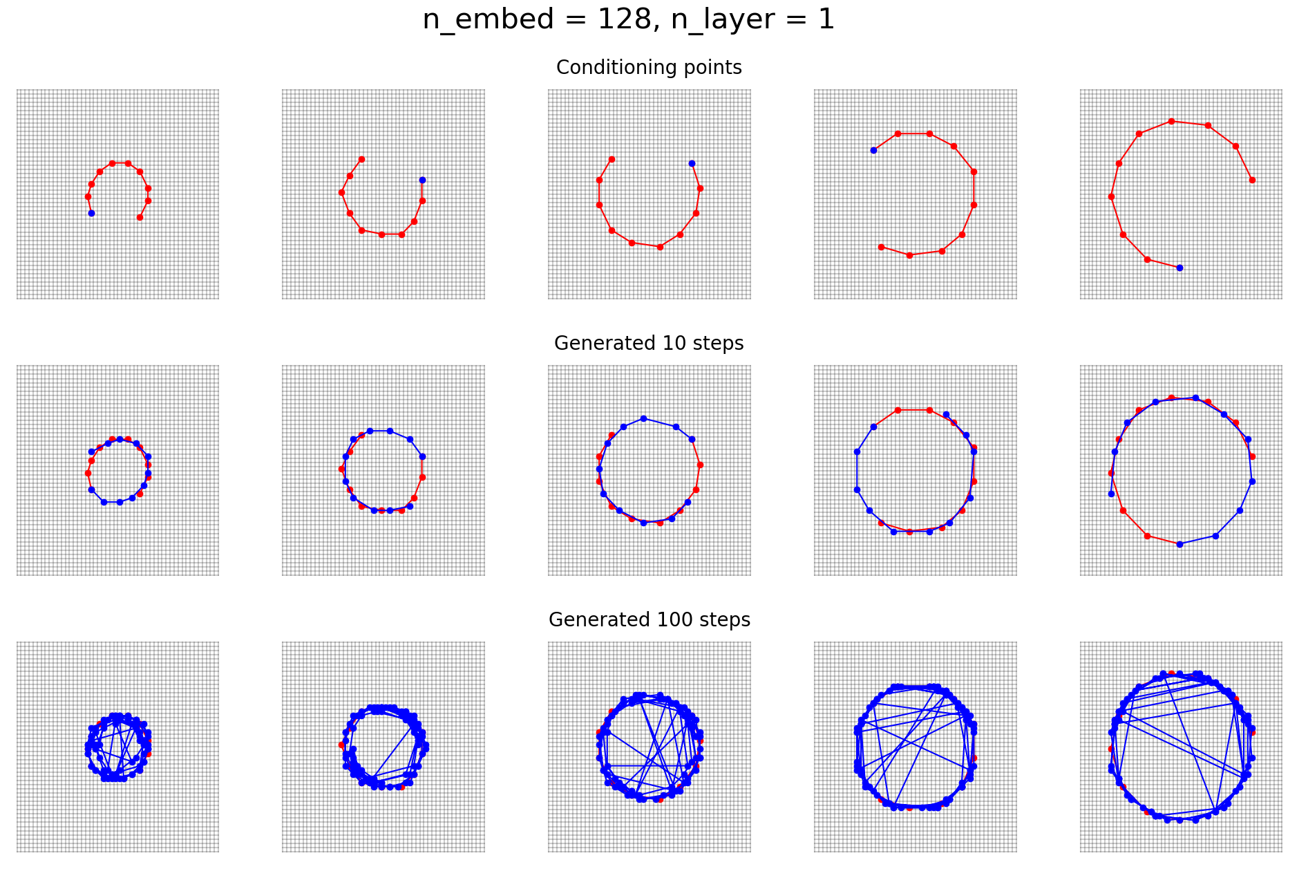 After training, we condition the model on the first 10 points (shown in red), and then generate the next 90 points autoregressively (shown in blue).