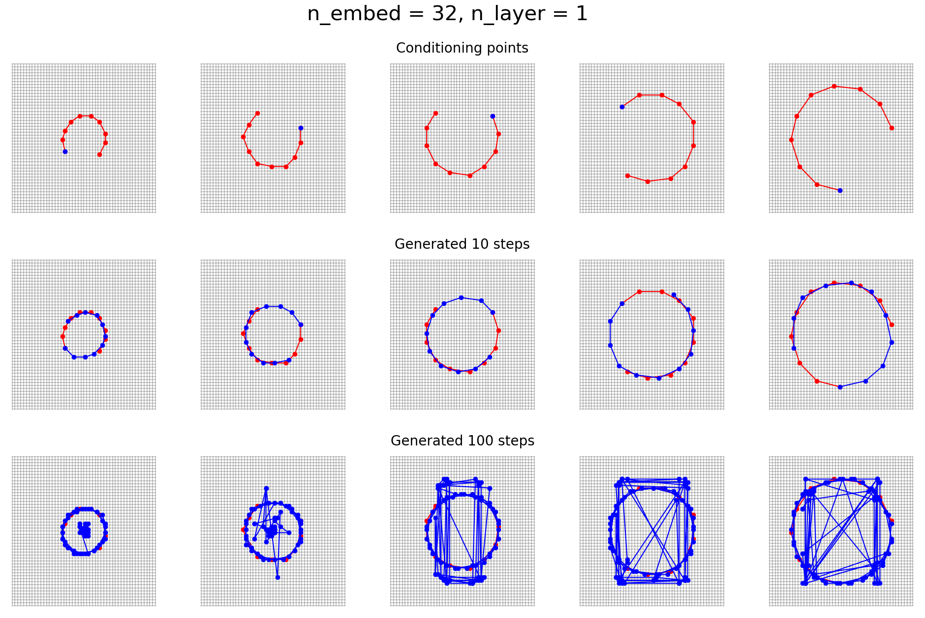 - Over longer generation horizons, the object remains approximately on the circle, but begins to jump all over it.
