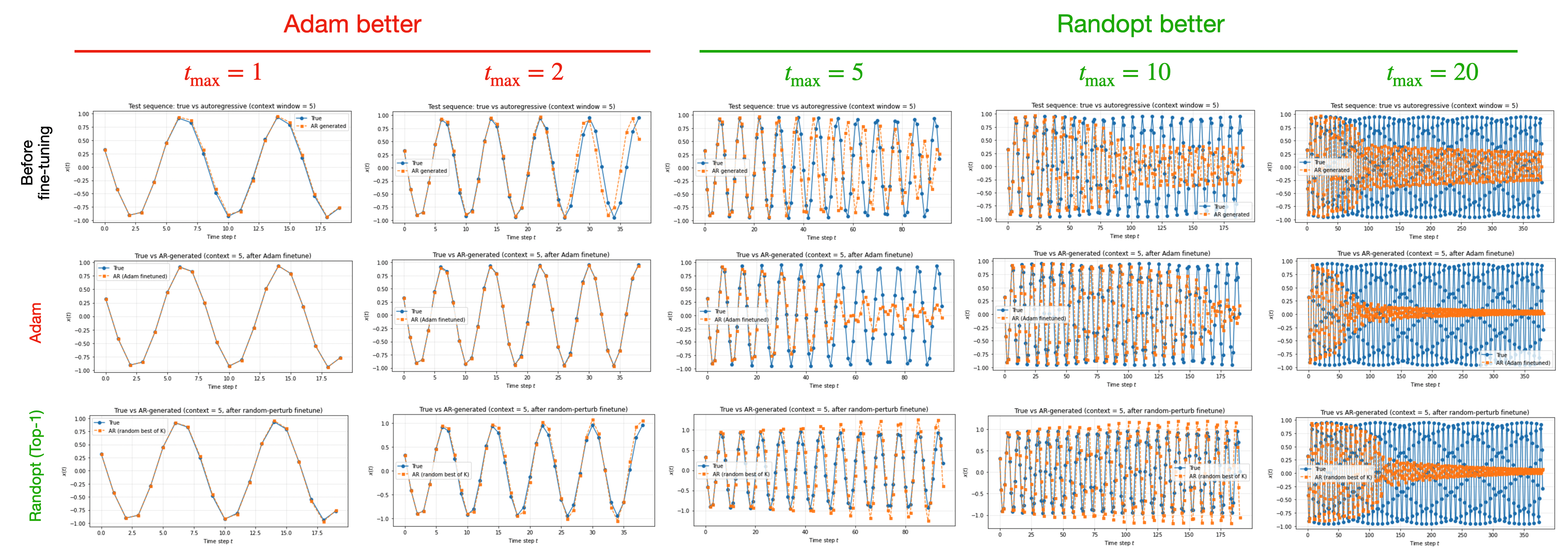 As we can see, Adam performs better when \(t_{\rm max}=1,2\), while RandOpt performs better when \(t_{\rm max}=5,10,20\). One possible explanation is:
