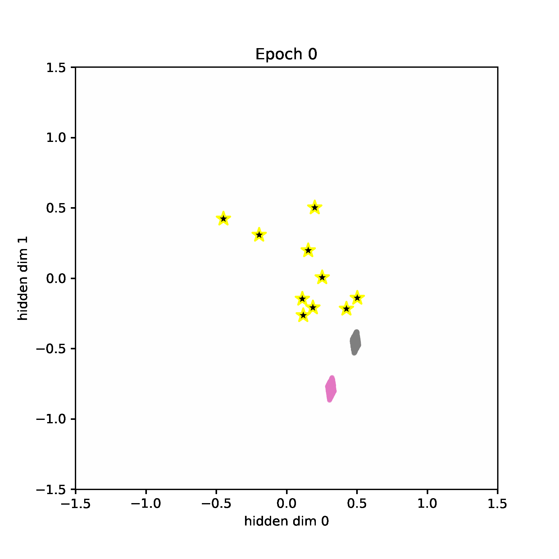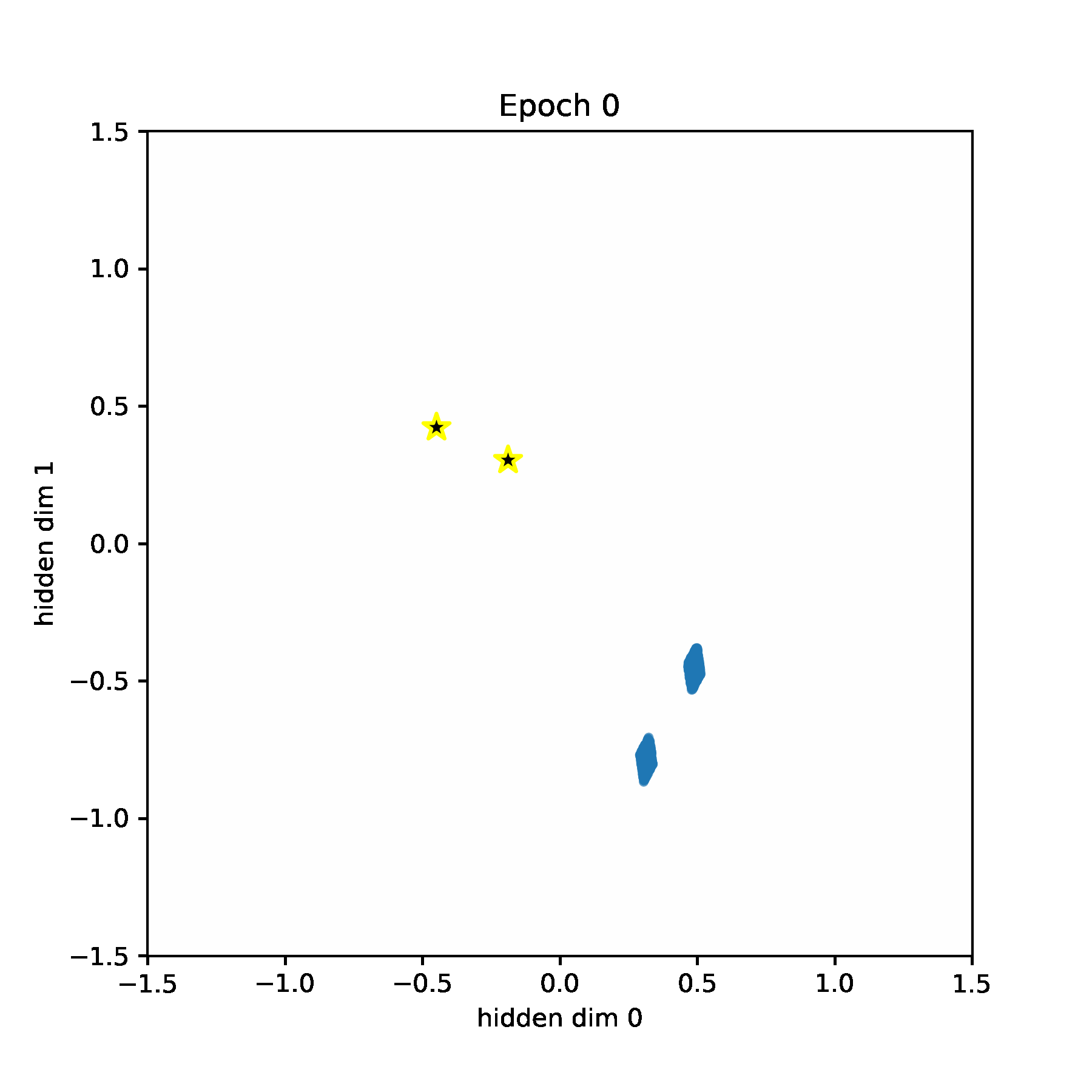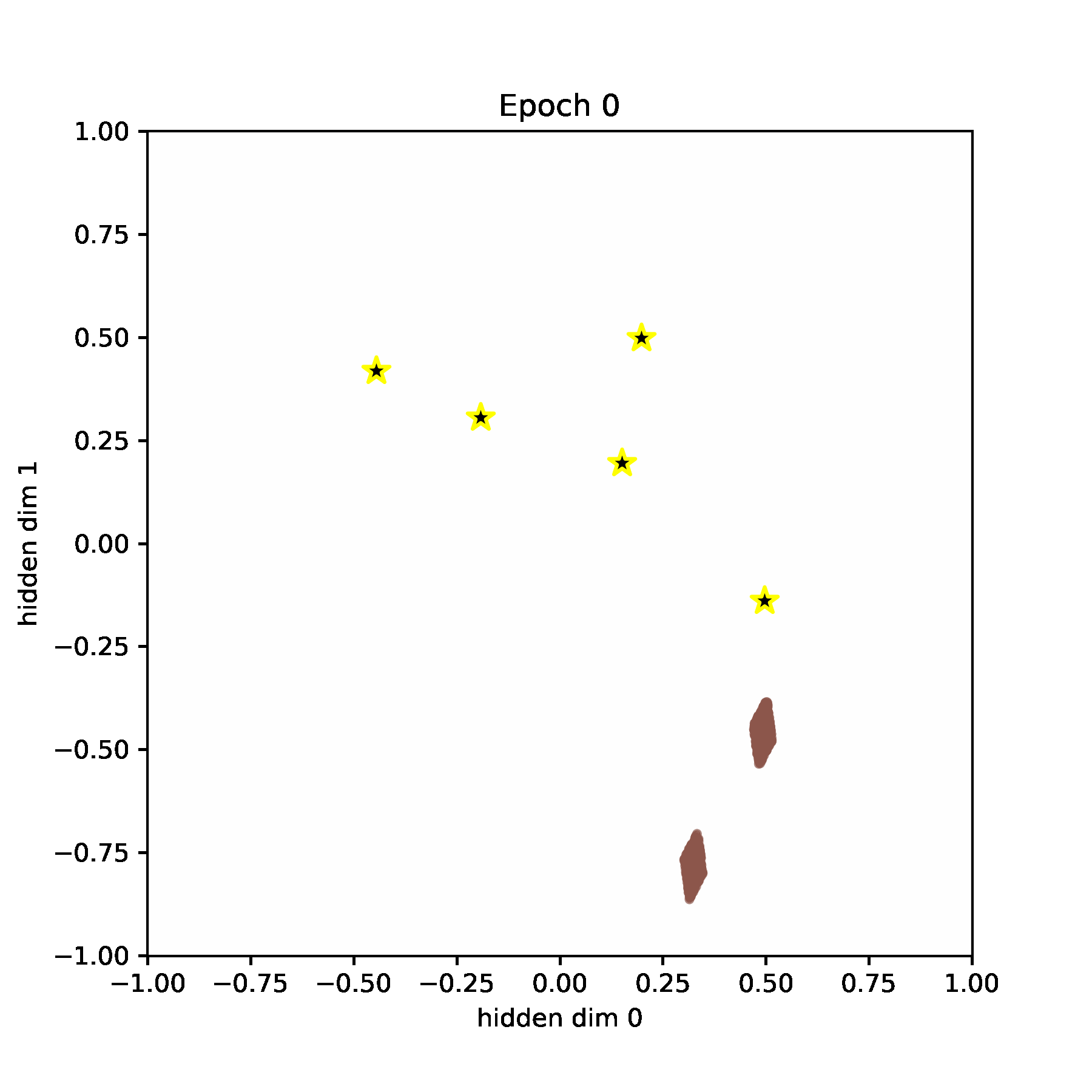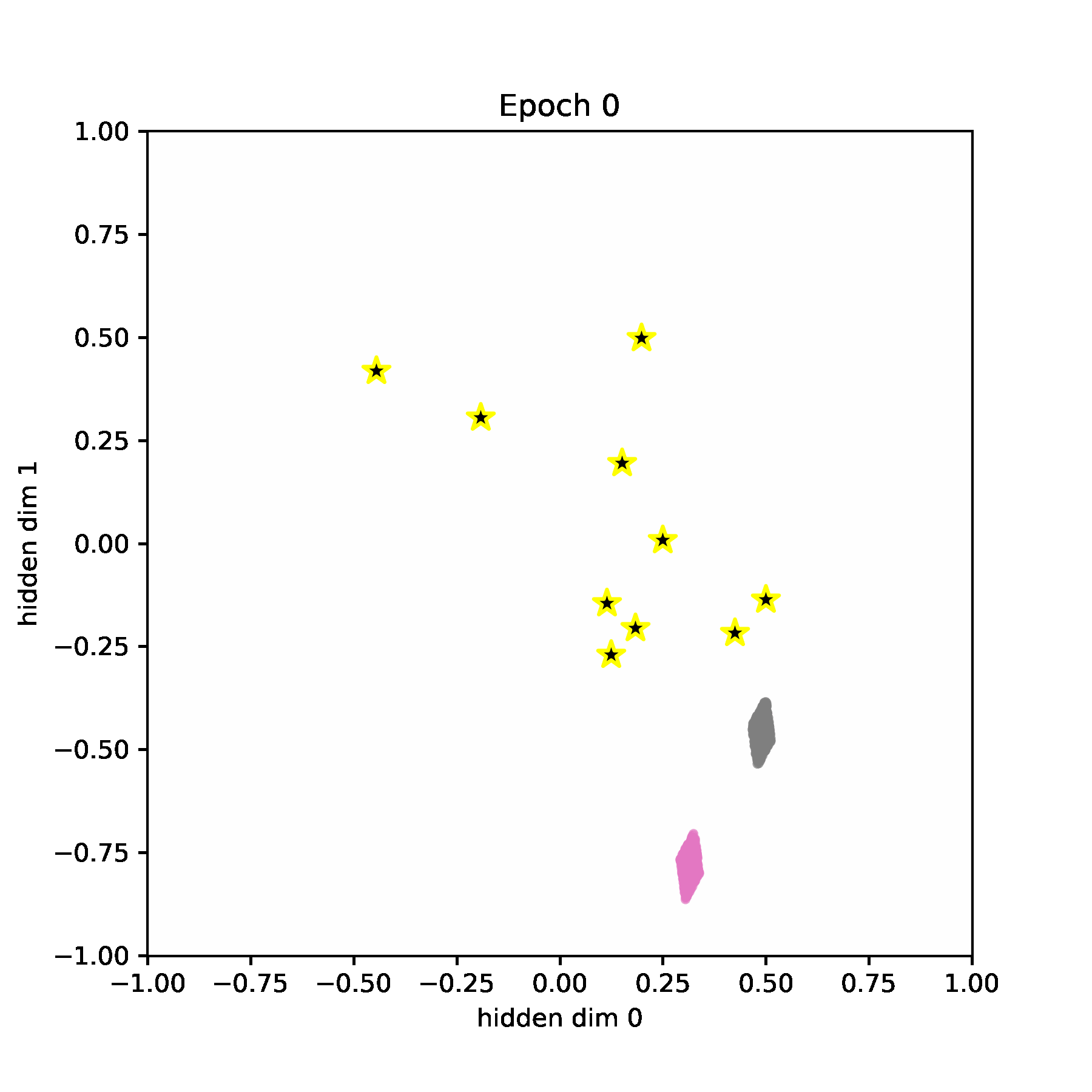 We visualize the hidden space during training. Codewords are visualized as stars. And the data points are visualized as blue points (they are very dense, so they look more like a rectangle or a diamond).