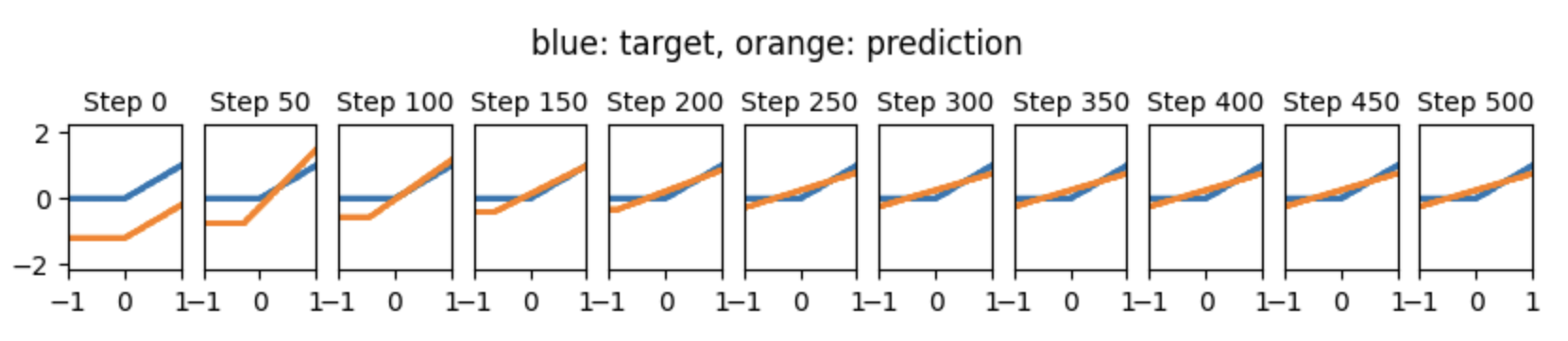 \[f(x; w_1, b_1, w_2, b_2) = w_2\sigma(w_1x+b_1)+b_2, \quad \sigma(x) ={\rm ReLU}(x) \equiv {\rm max}(0,x)\]For the teacher network, we set \(w_1^T = w_2^T = 1, \quad b_1^T = b_2^T = 0\), and so \(f(x)\equiv {\rm ReLU}(x)\). We take the input domain to be \(x \in [-1,1].\)