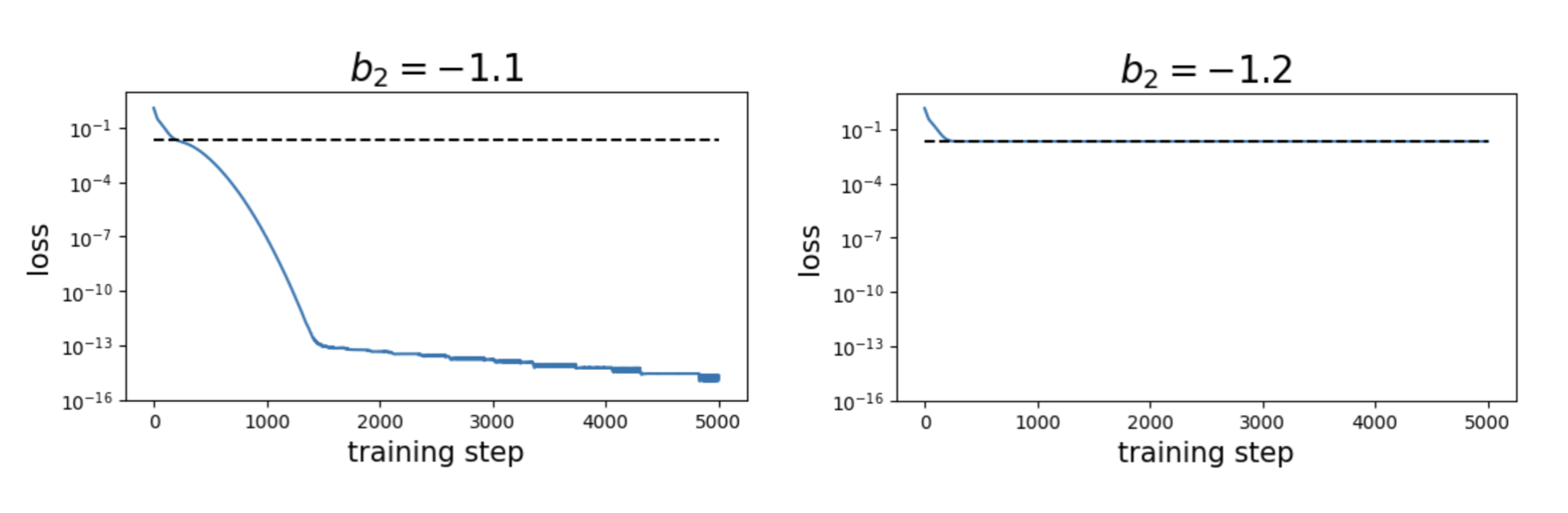 We fix \(b_1 = 0\), so the neuron is balanced at initialization. Is everything fine then? Not quite. We find that when \(b_2 = -1.1\), the loss can go to zero, but when \(b_2 = -1.2\), the loss gets stuck around 0.02 (again corresponding to approximating ReLU with linear regression).