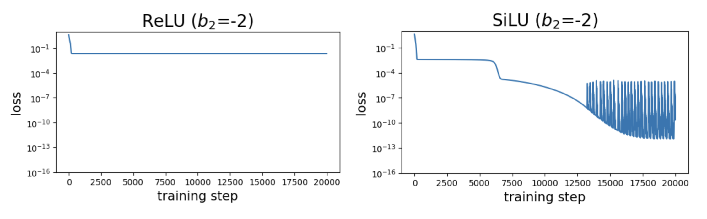 For SiLU, we observe that the loss can eventually reach zero (up to machine precision), but training gets stuck at saddle points for very long time, reducing training efficiency.