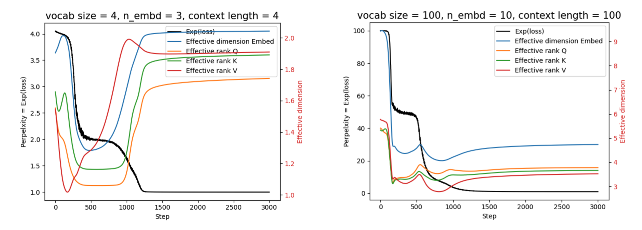 From the embedding visualizations above, we find that the embeddings initially expand along a single direction, and only later expand along another direction. Therefore, we expect that the effective dimensionality of the embeddings (defined in the same way as in the previous blog post), as well as the effective rank of the Q/K/V matrices, should exhibit corresponding dynamics.