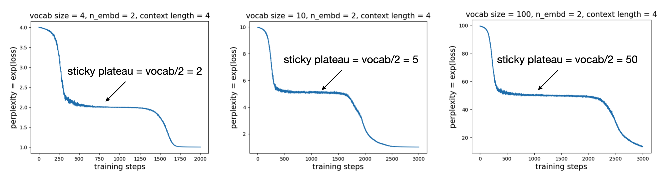 We examine the loss curves (in practice, we plot perplexity, i.e. \({\rm exp(loss)}\)). For embedding dimension = 2 and context length = 4, as we vary the vocabulary size, we consistently observe a sticky plateau, where the perplexity corresponds to half of the vocabulary size.