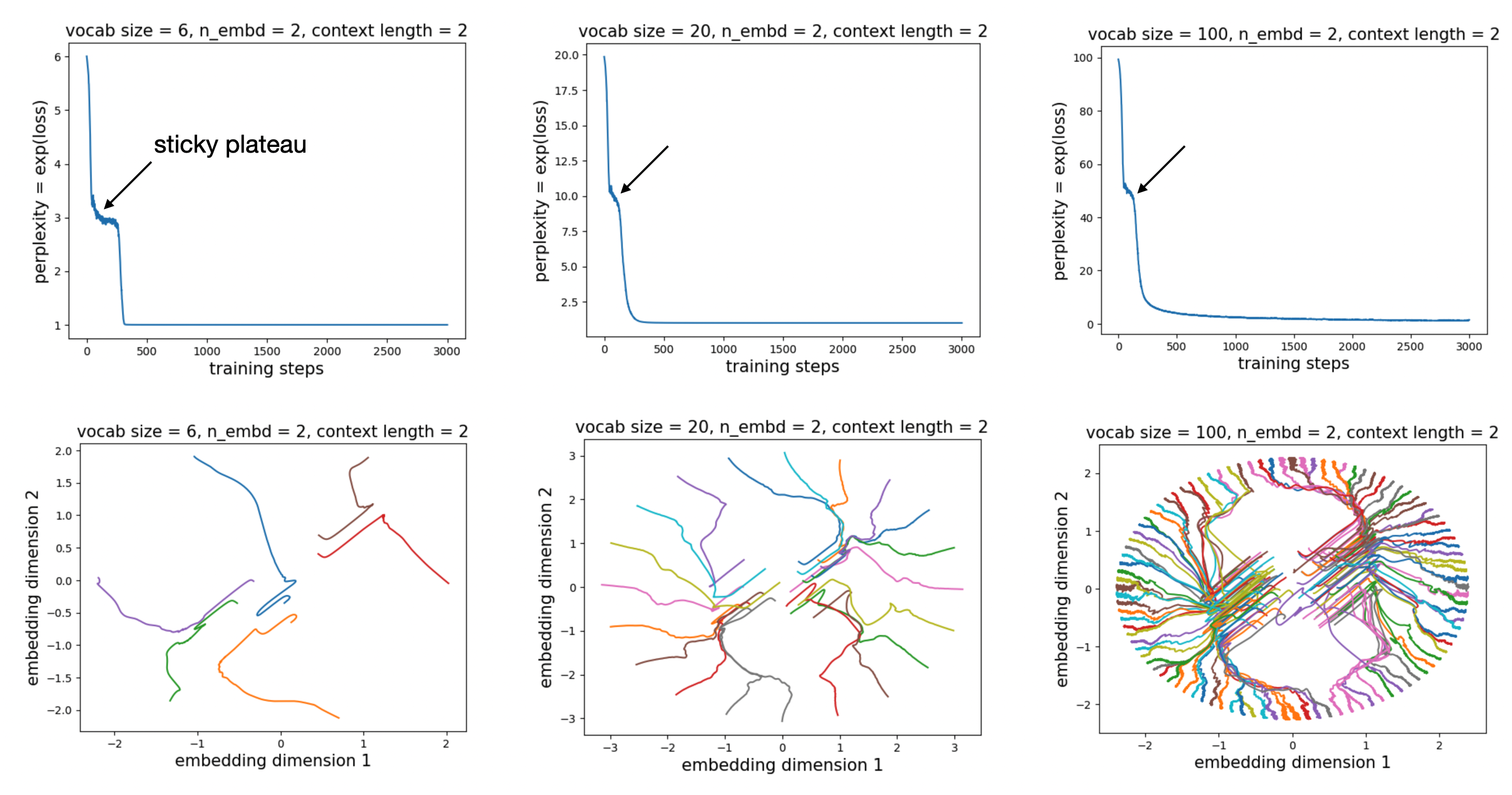We examine the loss curves (in practice, we plot perplexity, i.e. \({\rm exp(loss)}\)). For embedding dimension = 2 and context length = 2 (task: \([A][B]\to[A]\)), as we vary the vocabulary size, we consistently observe a sticky plateau (as in the previous blog), where the perplexity is approximately half of the vocabulary size.