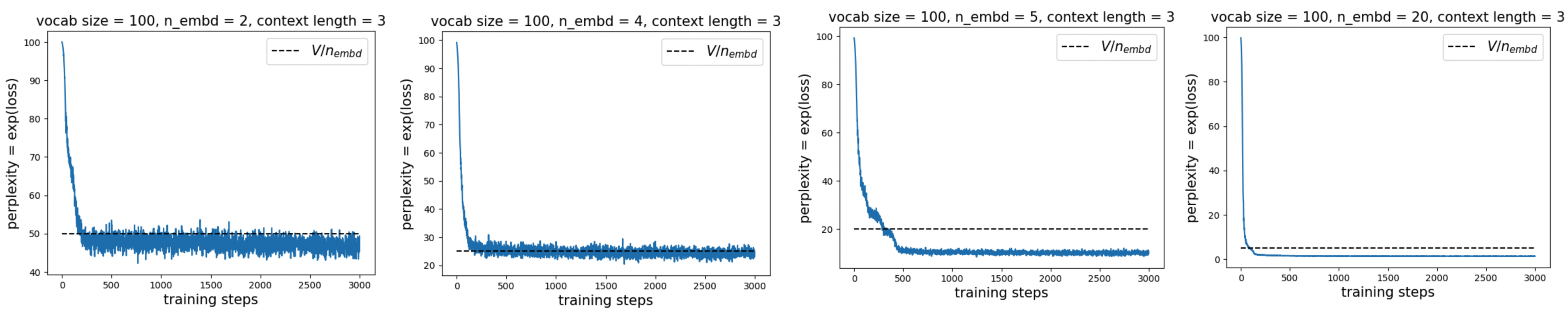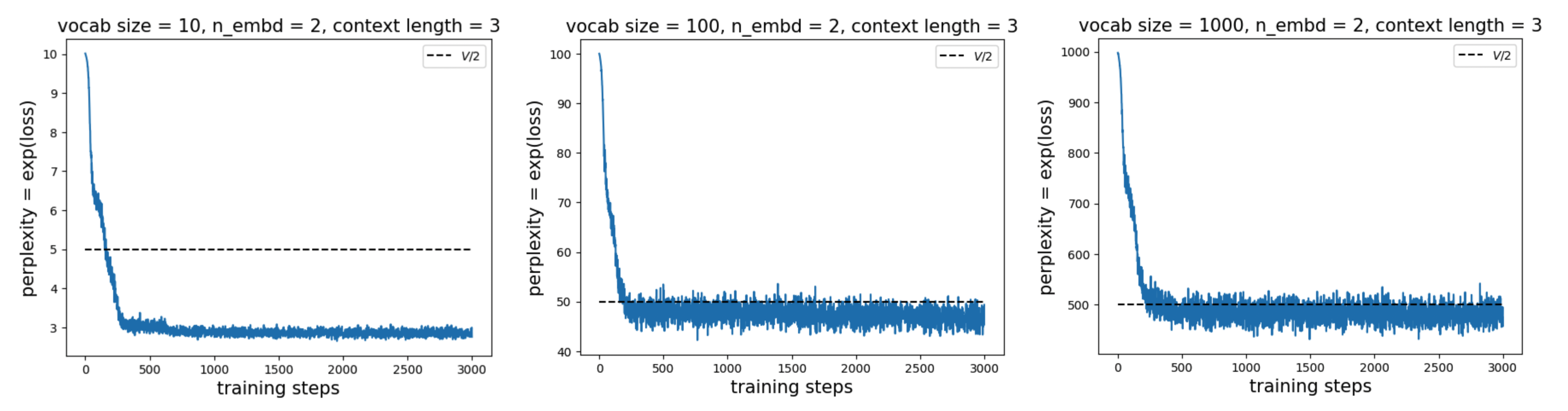 We examine the loss curves (in practice, we plot perplexity, i.e., \({\rm exp(loss)}\)). For embedding dimension = 2 and context length = 3 (task: \([1][5][6]\to[5]\)), as we vary the vocabulary size, we consistently observe that perplexity converges to \(V/2\) (or lower, for smaller \(V\)).