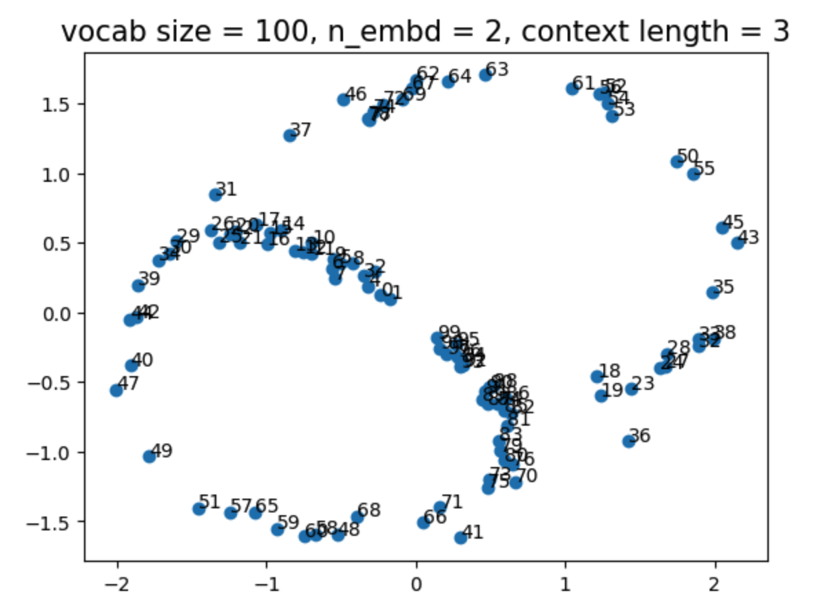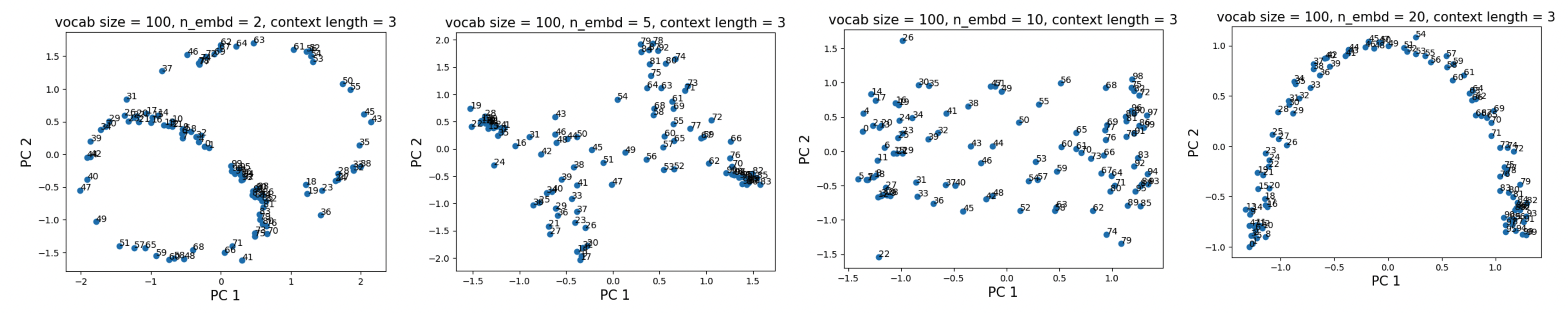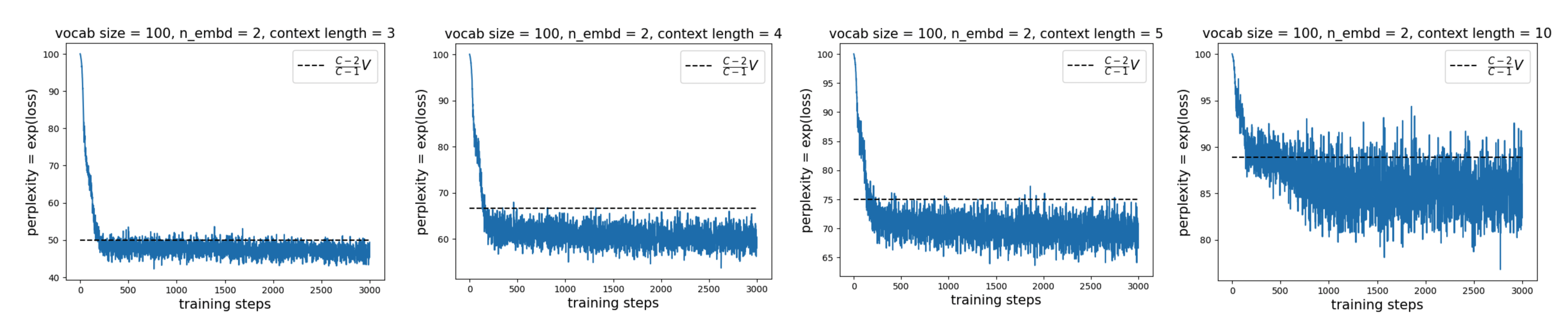 The existence of structure may explain why the perplexity can fall slightly below \(V/2\): the continuous geometric structure is partially learned and leveraged to reduce the loss. However, the model largely becomes confused (similar to what we observed in the previous blog) and effectively guesses a random token from the previous context. This leads to a perplexity of \(\frac{C-2}{C-1}V\), which qualitatively (though not quantitatively) matches the experimental results: