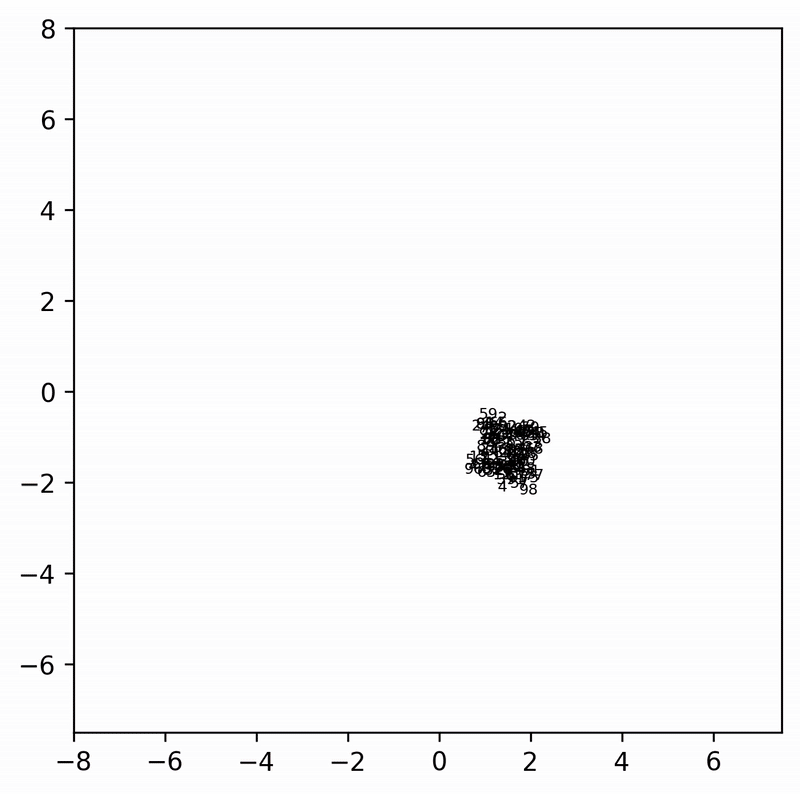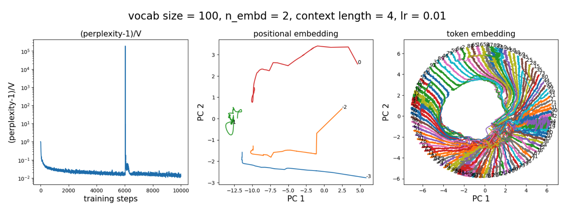 However, because the learning rate is too large, the token embeddings fluctuate wildly and fail to converge to a maximally separable solution (nearby points are placed equidistantly on a circle). The learning rate is so large that tokens swap positions. The loss spike around 6000 steps corresponds to this swapping process, during which the model is confidently wrong for some tokens, leading to very large losses. This GIF illustrates the behavior more clearly: