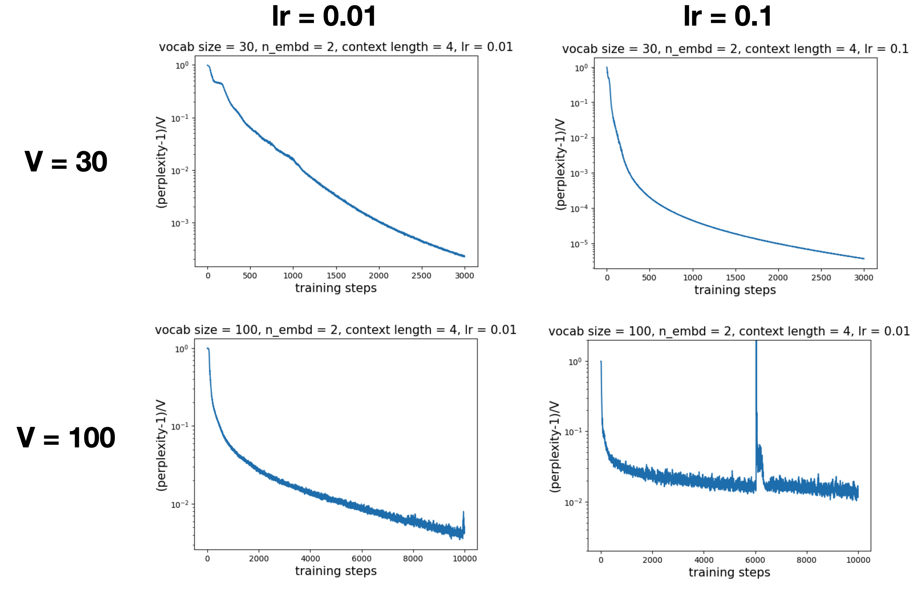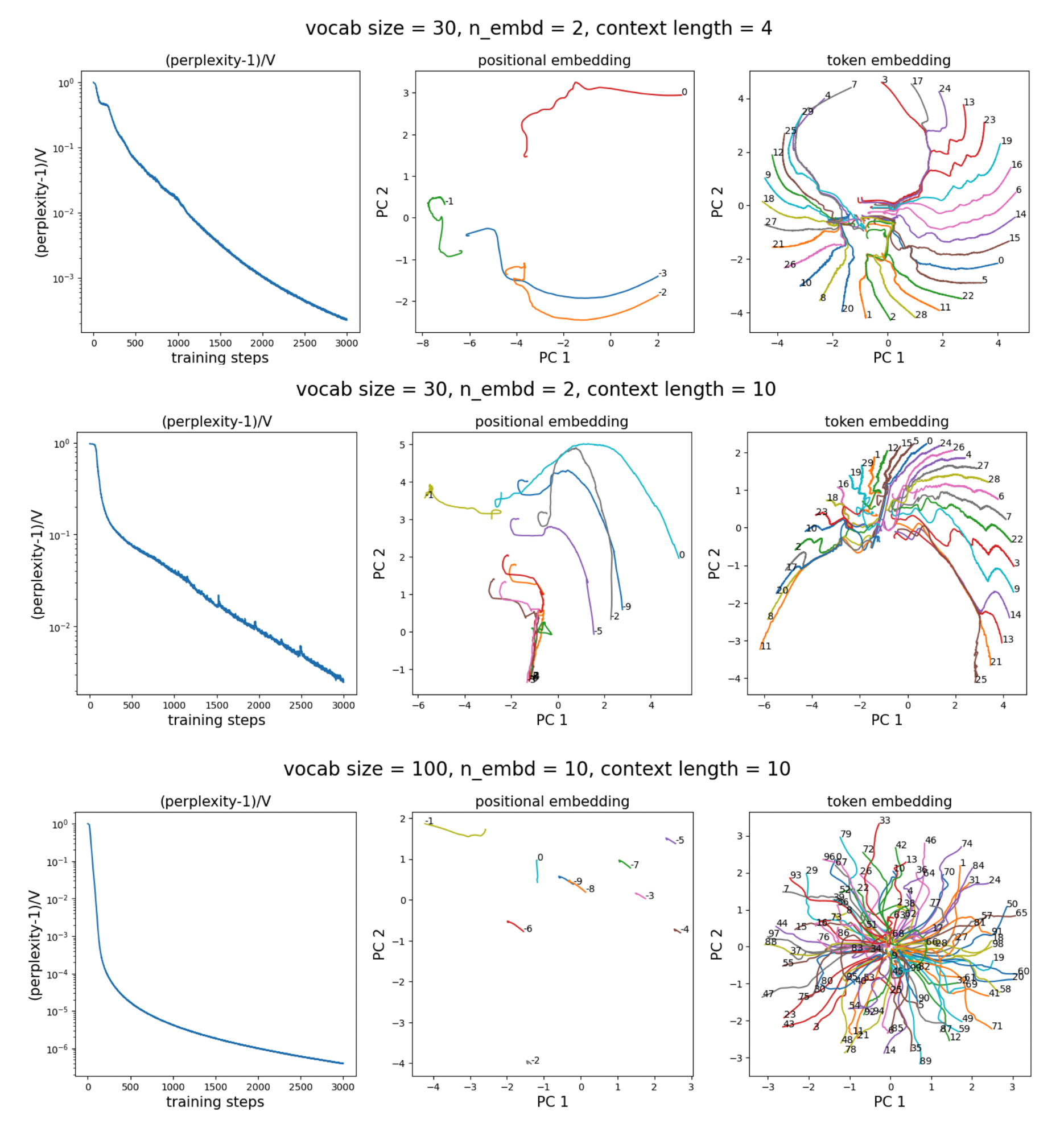 However, the task is not solved exactly, but only approximately. With larger vocab size or larger context length, the task becomes harder for the model to approximate, so the relative perplexity \(({\rm perplexity} - 1)/V\) increases. In contrast, a larger embedding dimension helps reduce the relative perplexity.