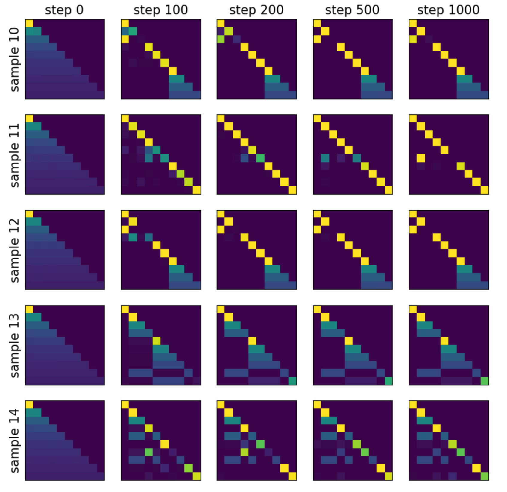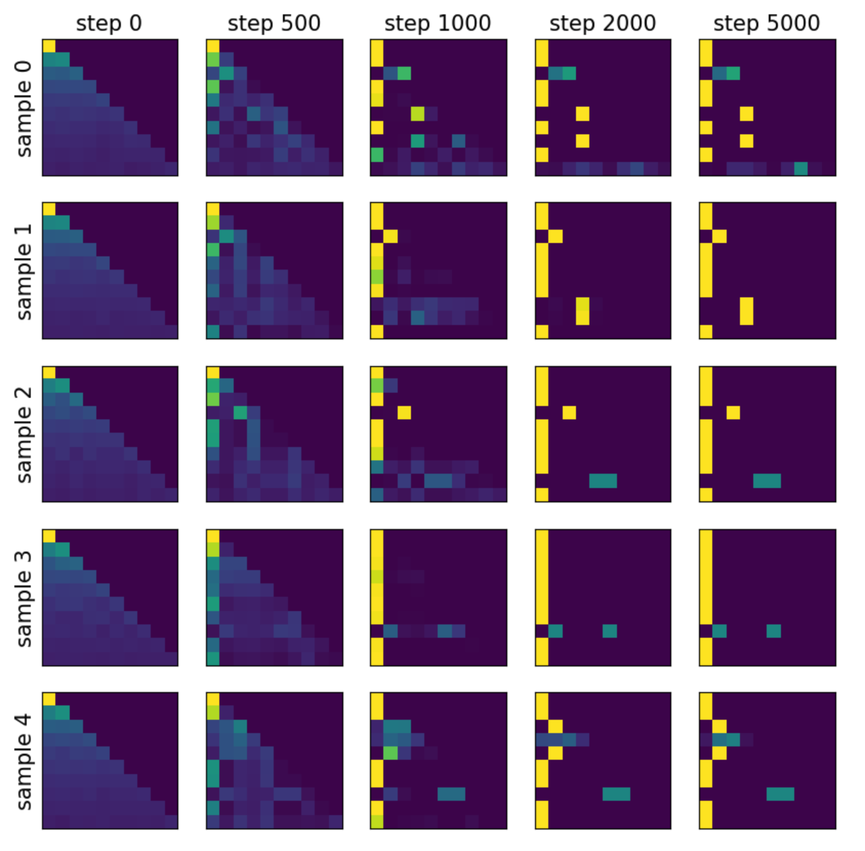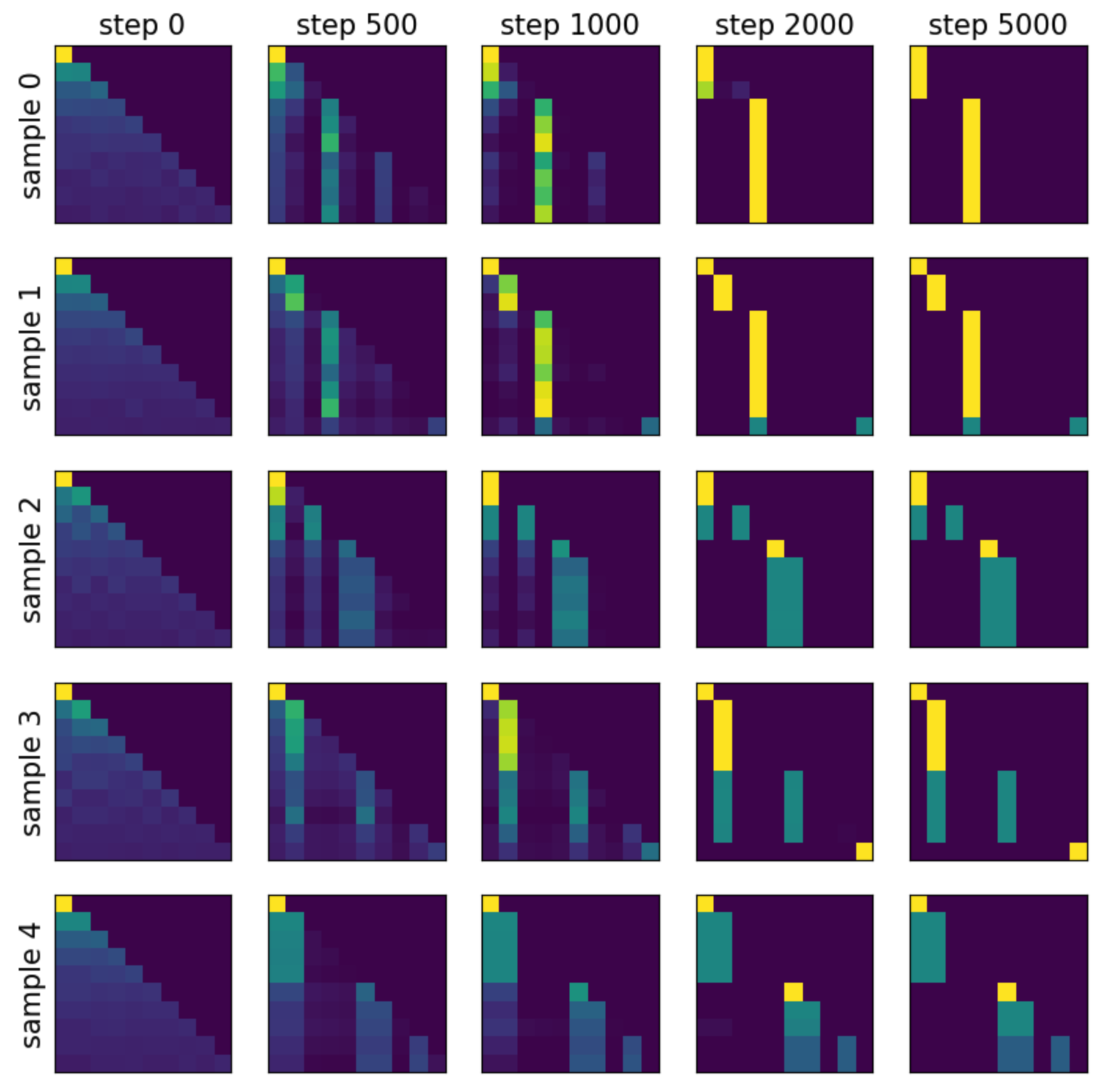 The attention maps are shown below. Each row corresponds to a different sample, and each column corresponds to a different training step. Besides the [BOS] token, frequent tokens are also used to absorb attention.