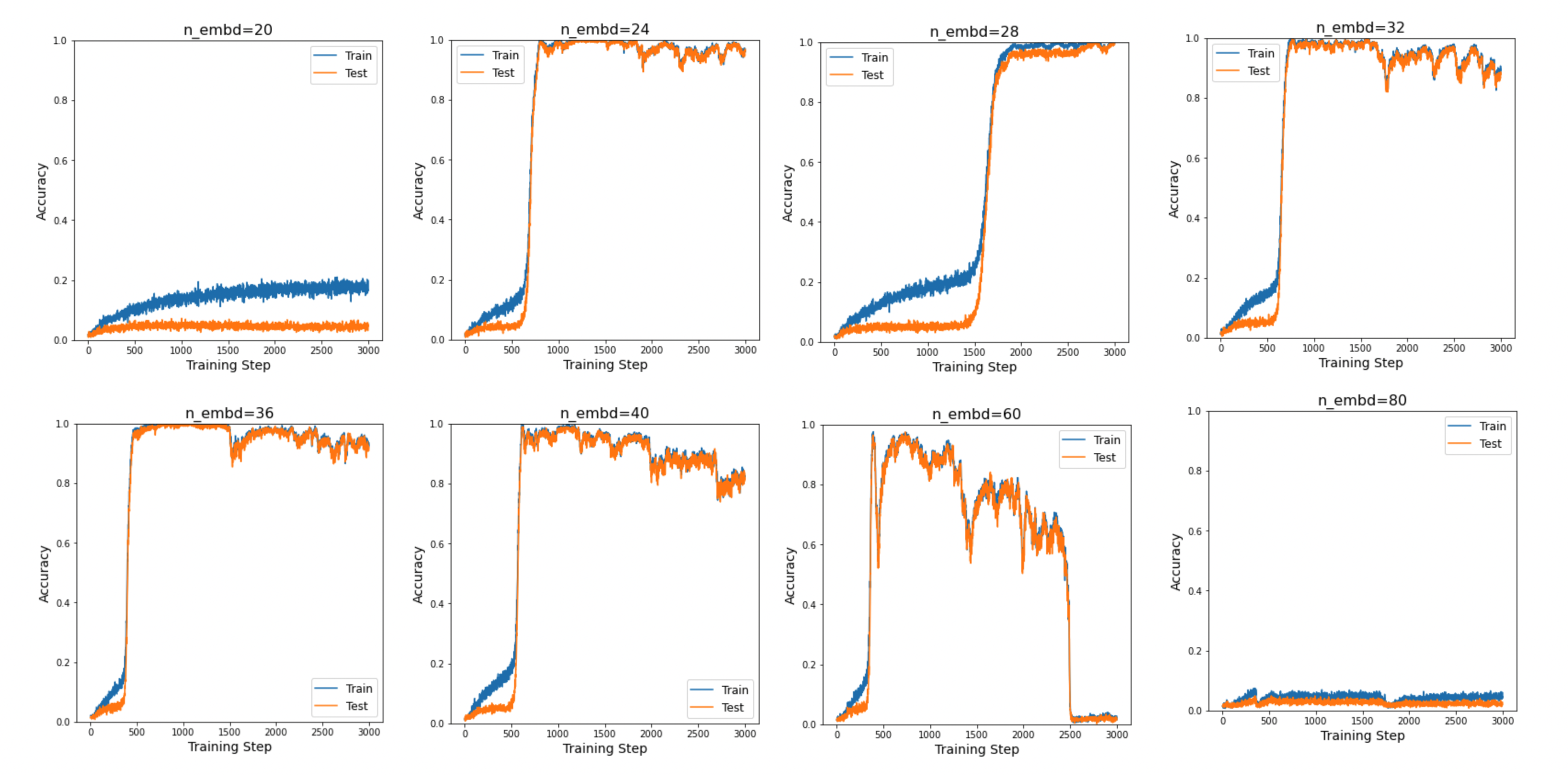 Indeed, we find a Goldilocks zone in which ICL emerges in fewer than 1000 steps. Both too small and too large embedding dimensions lead to failure. An embedding dimension of 60 is particularly interesting: the model initially learns but then becomes unstable, likely due to an excessively large learning rate.