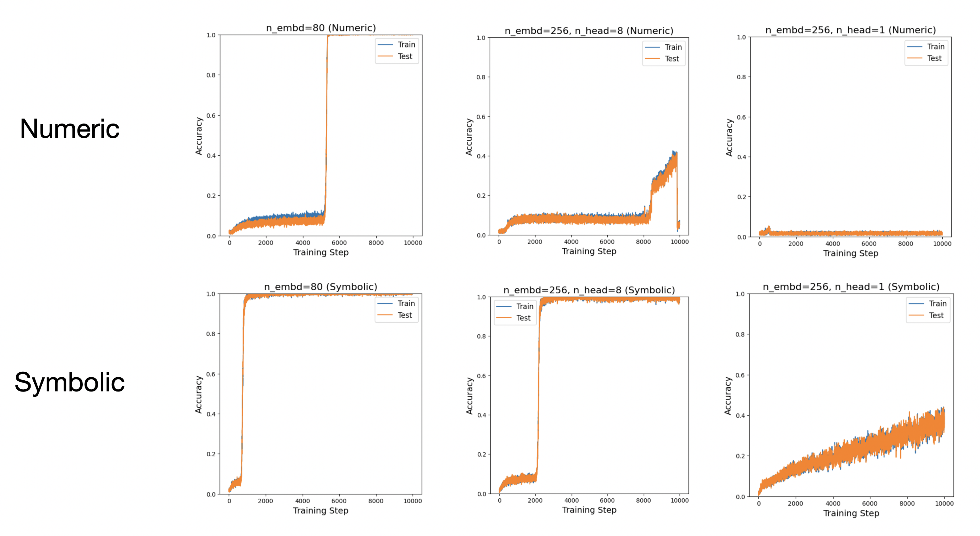 Therefore, we adopt the same setup as Sparse-attention-6, but randomly resample the token embedding matrix at every step. We refer to this setup as “symbolic” training, and call the standard setup “numeric” training.