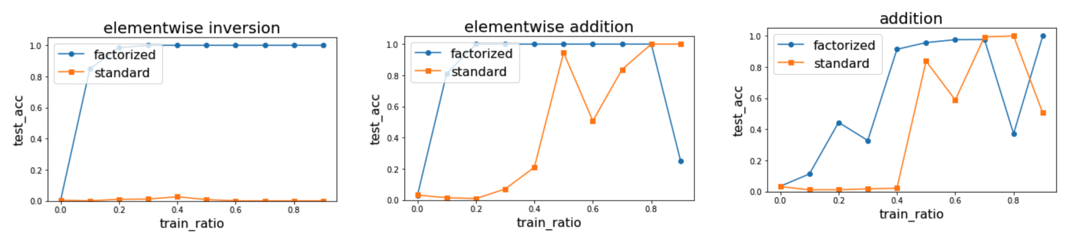Note that in the elementwise inversion task, test accuracy is close to zero because test tokens are never seen during training. However, factorized tokenization is still able to generalize due to the compositional generalization of sub-tokens.