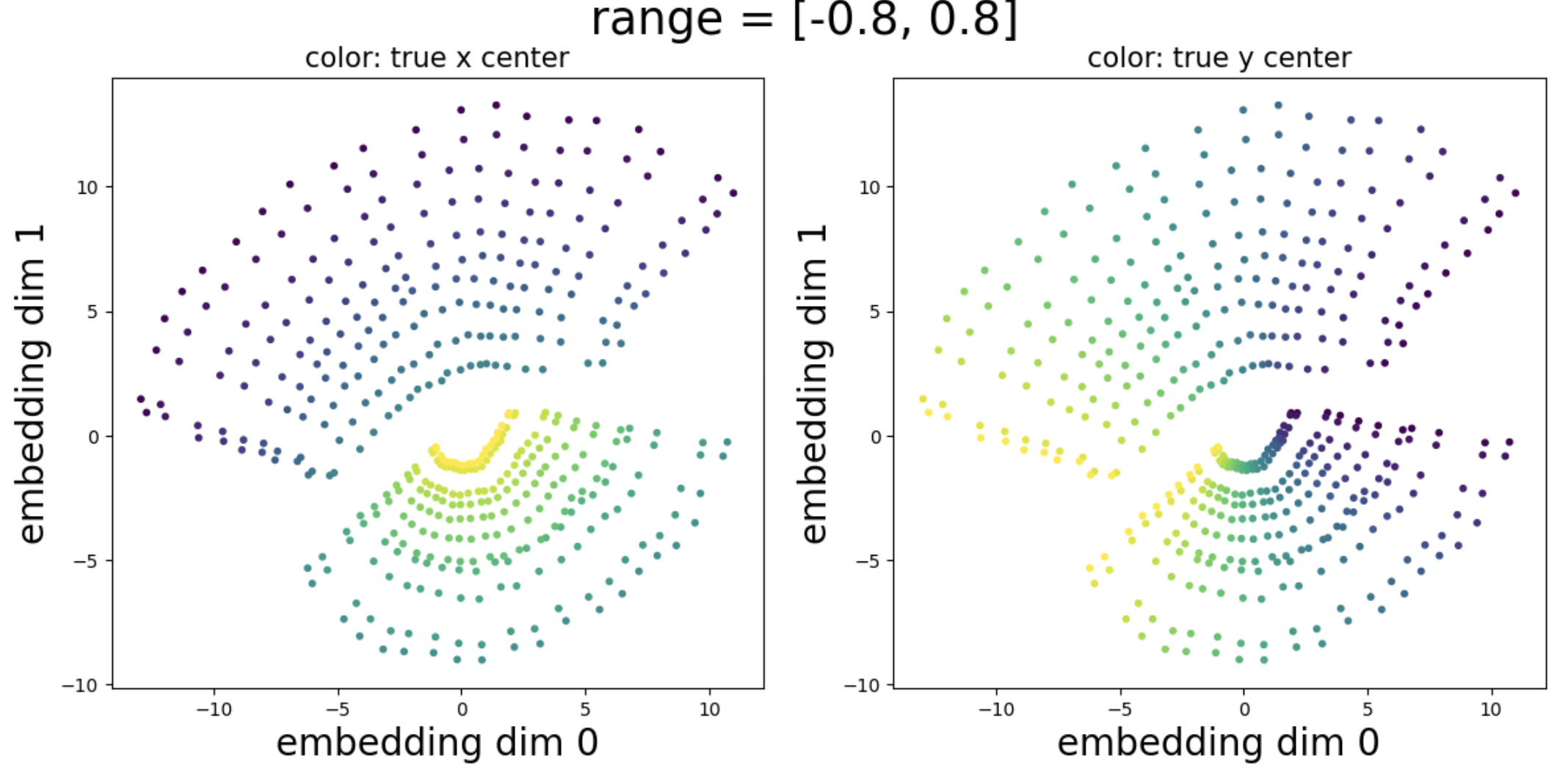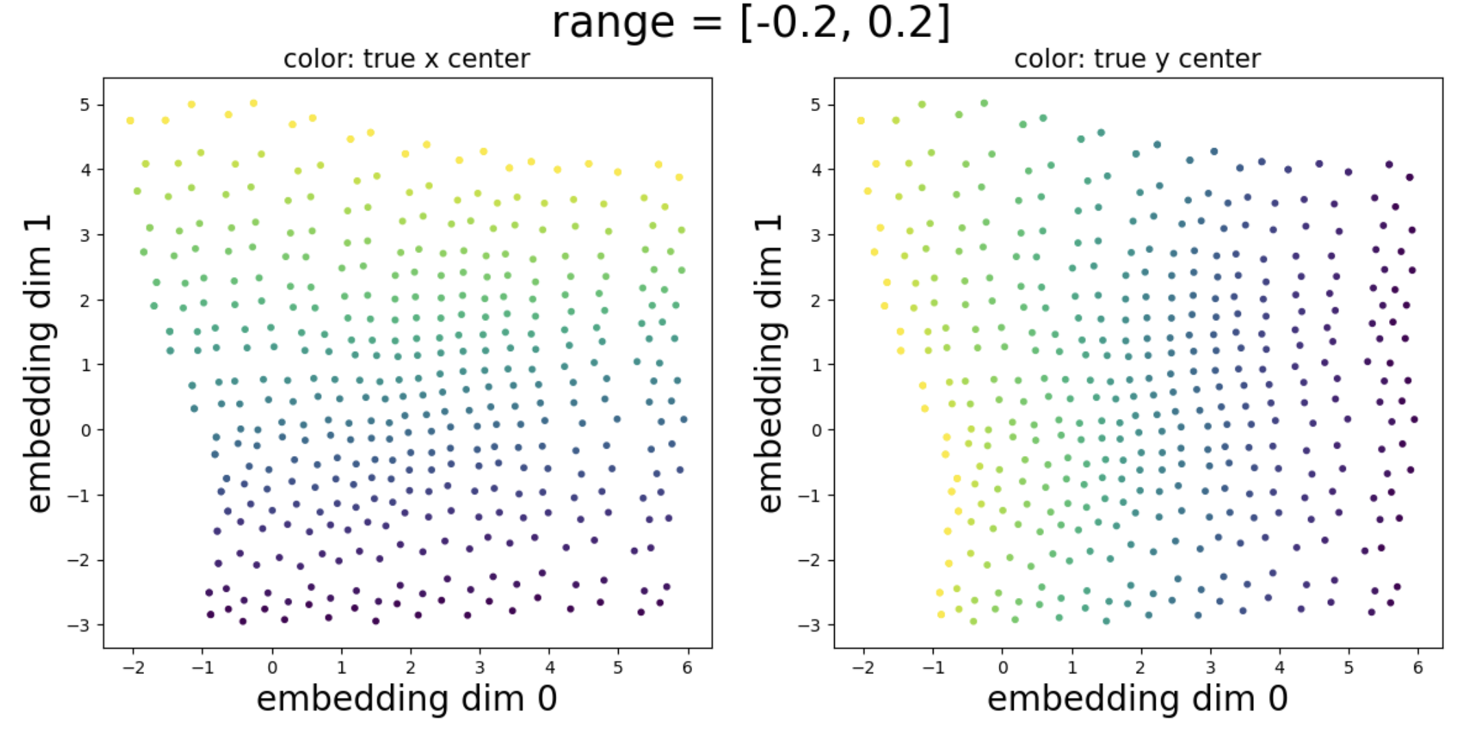 One might expect that an embedding dimension of 2 should suffice, since the true degrees of freedom of the square images are only two: the \(x\) and \(y\) coordinates. Indeed, we find that embed dim = 2 works, and embed dim = 100 also works (as expected). However, the two cases appear to use very different algorithms internally.