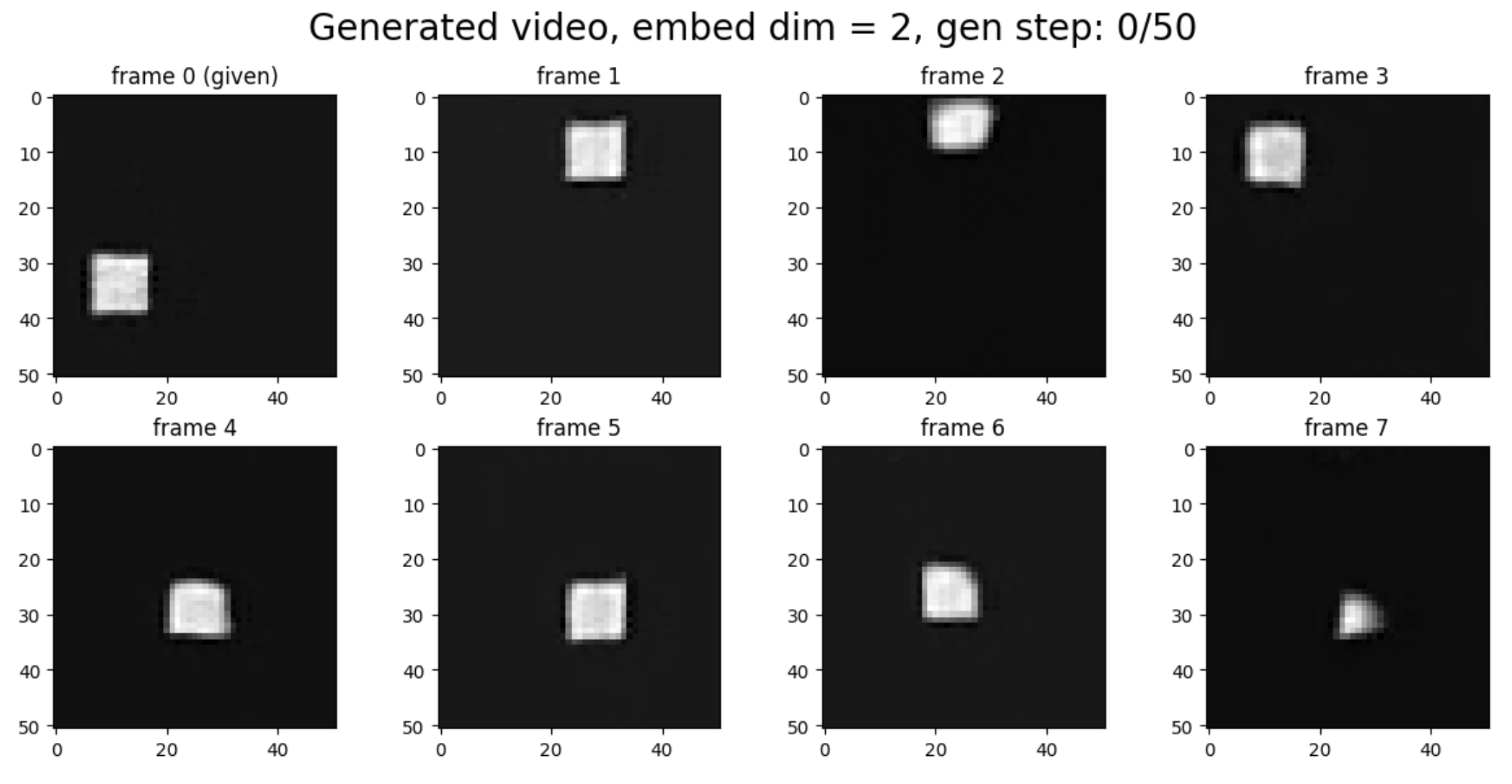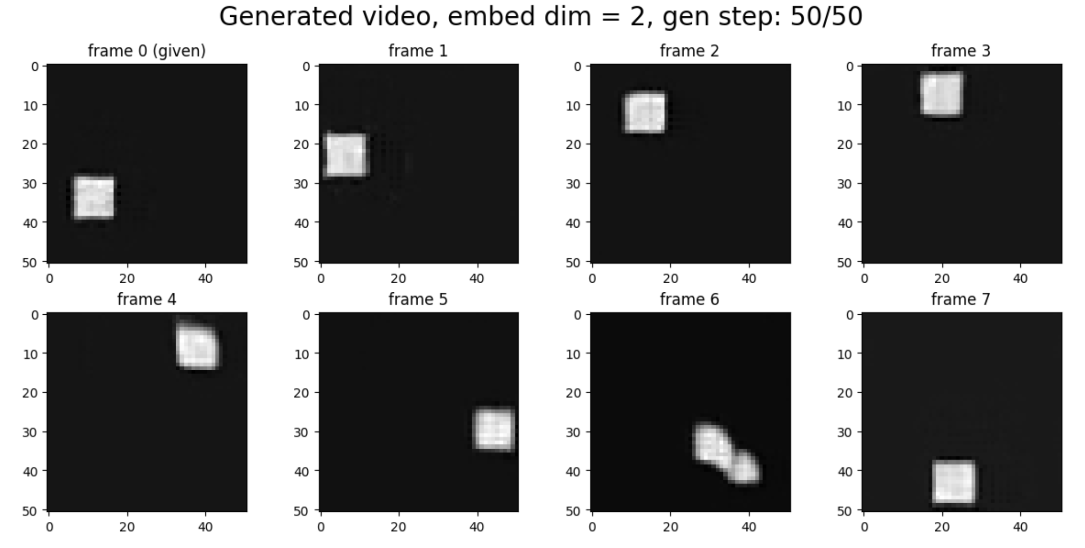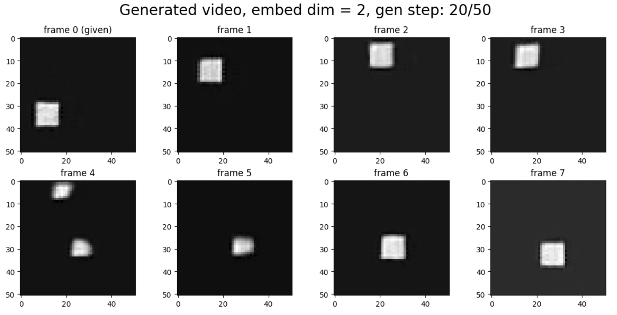 In particular, when embed dim = 100 and sampling step = 20 (out of 50), frame 1/2 appears to represent both possibilities simultaneously (the square in frame 0 moving either clockwise or counter-clockwise).