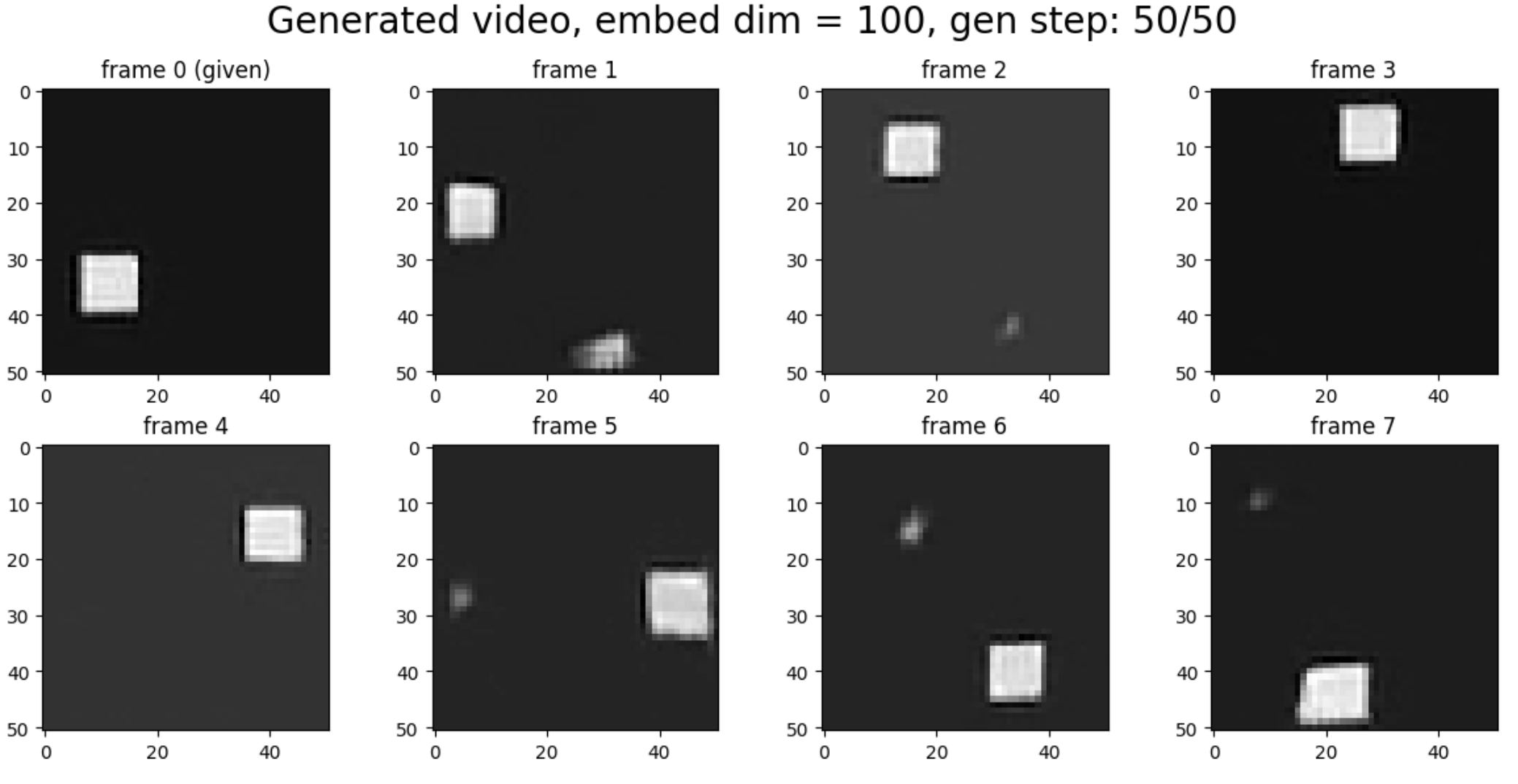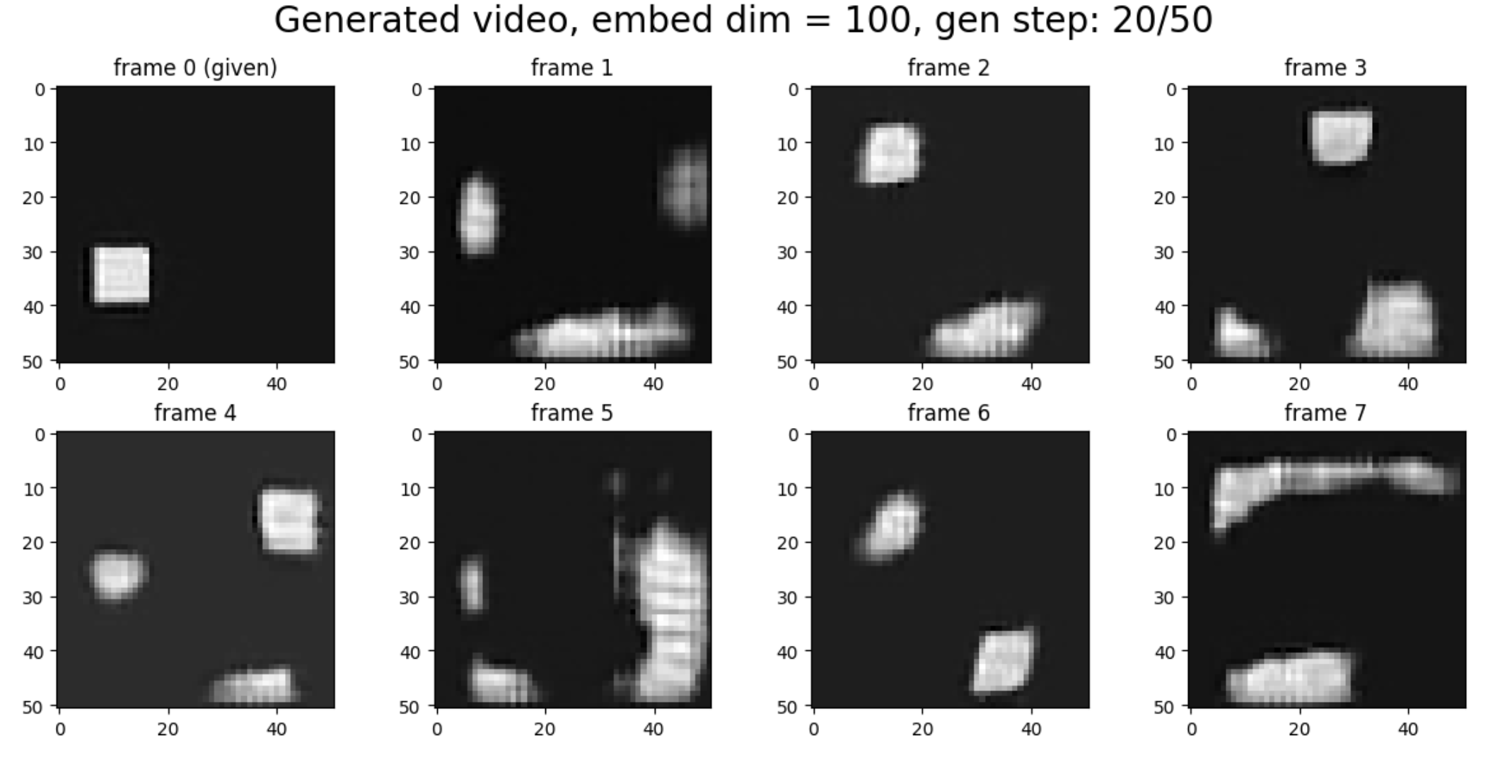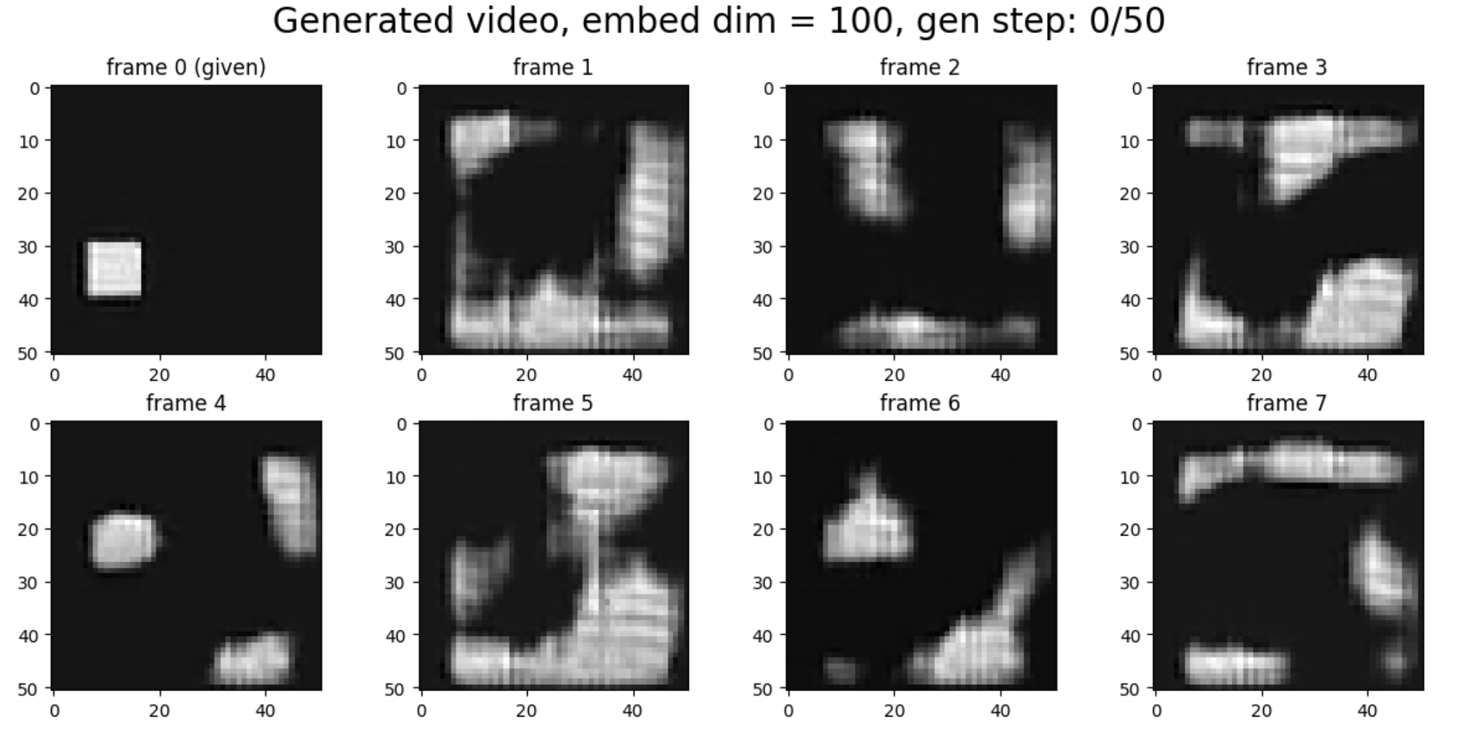 In particular, when embed dim = 100 and sampling step = 20 (out of 50), frame 1/2 appears to represent both possibilities simultaneously (the square in frame 0 moving either clockwise or counter-clockwise).