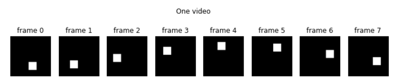 Each frame is a grayscale image containing a square. The center of the square follows a circular trajectory. The radius is randomly sampled, the starting angle is randomly sampled, and the rotation direction (clockwise or counter-clockwise) is also randomly sampled. The angular velocity is fixed at 45 degrees per frame, and each video consists of 8 frames.